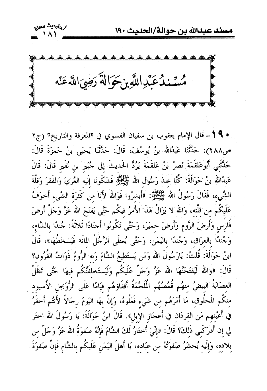 190- قال الإمام يعقوب بن سفيان الفسوي في "المعرفة والتاريخ" (ج2ص88) : حدثنا عبد الله بن يوسف، قال: حدثنا يحيى بن حمزة، قال: حدثنى أبو علقمة، يرد الحديث إلى جبير بن نفير قال: قال عبد الله بن حوالة رضى الله عنه: كنا عند رسول الله صَلَّى اللَّهُ عَلَيْهِ وعلى آله وَسَلَّمَ فشكونا إليه العرى والفقر وقلة الشئ فقال رسول الله صَلَّى اللَّهُ عَلَيْهِ وعلى آله وَسَلَّمَ: أبشروا فوالله لأنا بكثرة الشئ أخوفني عليكم من قلته، والله لا يزال هذا الامر فيكم حتى يفتح الله ارض فارس وارض الروم وارض حمير وحتى تكونوا اجنادا ثلاثة جندا بالشام وجندا بالعراق وجندا باليمن وحتى يعطى الرجل المائة فيسخطها، قال ابن حوالة ك قلت: يارسول الله ومن يستطيع الشام وبه الروم ذوات القرون؟ قال والله ليفتحها الله عليكم وليستخلفنكم فيها حتى يظل العصابة البيض منهم قمصهم الملحمة اقفاؤهم قياما على الرويجل الاسود منكم المحلوق ما امرهم من شئ فعلوه وان بها رجالا لأنتم أحقر في أعينهم من القردان في اعجاز الابل، قال ابن حوالة: فقلت: يارسول الله اختر لى ان ادركني ذلك قال انى اختار لك الشام فانه صفوة الله من بلاده واليه تجتبى صفوته من عباده يا اهل اليمن عليكم بالشام فان صفوة