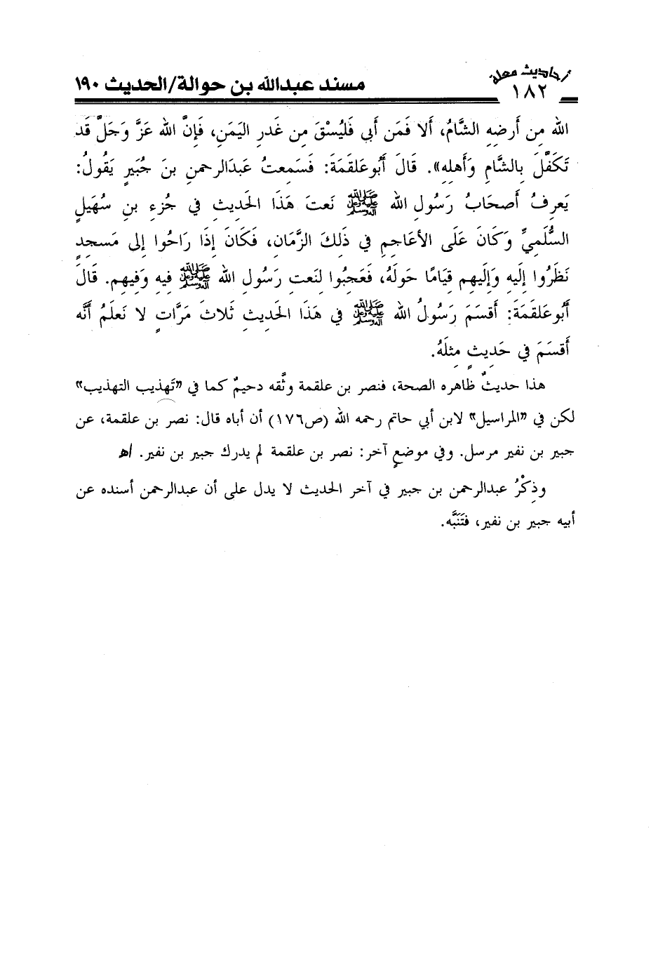الله من ارضه الشام ألا فمن أبى فليستبق في غدر اليمن فان الله قد تكفل لى بالشام واهله - قال أبو علقمة فسمعت عبد الرحمن بن جبير يقول: يعرف أصحاب رسول الله صَلَّى اللَّهُ عَلَيْهِ وعلى آله وَسَلَّمَ نعت هذا الحديث في جزء بن سهيل السلمى وكان على الاعاجم في ذلك الزمان فكان إذا راحوا إلى مسجد نظروا إليه واليهم قياما حوله فعجبوا لنعت رسول الله صَلَّى اللَّهُ عَلَيْهِ وعلى آله وَسَلَّمَ فيه وفيهم، قال أبو علقمة أقسم رسول الله صَلَّى اللَّهُ عَلَيْهِ وعلى آله وَسَلَّمَ في هذا الحديث ثلاث مرات لا نعلم أنه أقسم في حديث مثله.
