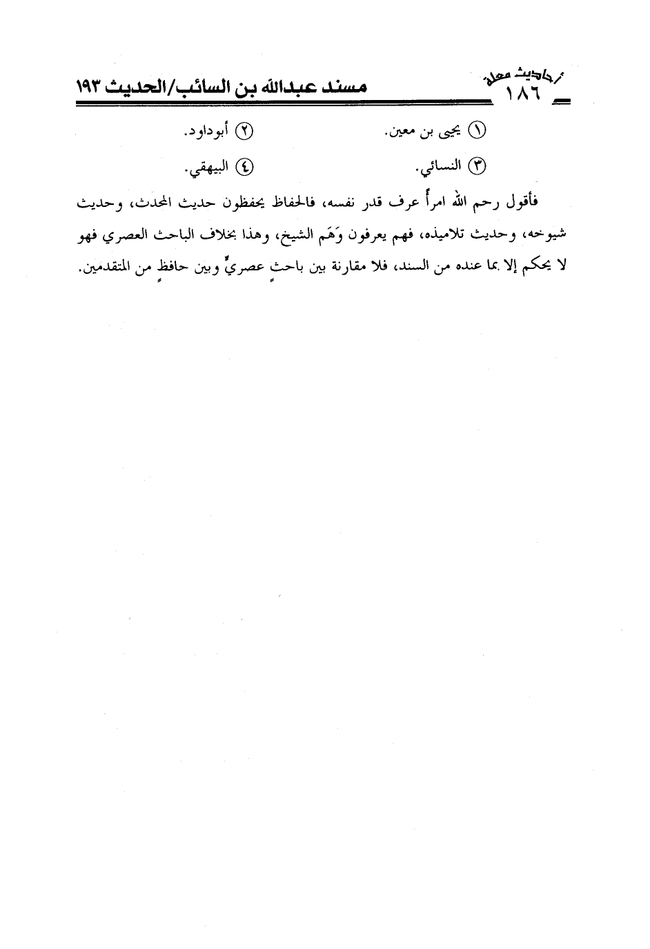 فأقول: رحم الله من عرف قدر نفسه فالحفاظ يحفظون حديث المحدث وحديث شيوخه وحديث تلاميذه فهم يعرفون وهم الشيخ، وهذا بخلاف الباحث العصرى فهو لايحكم إلا بما عنده من السند فلا مقارنة بين باحث عصرى وبين حافظ من المتقدمين.