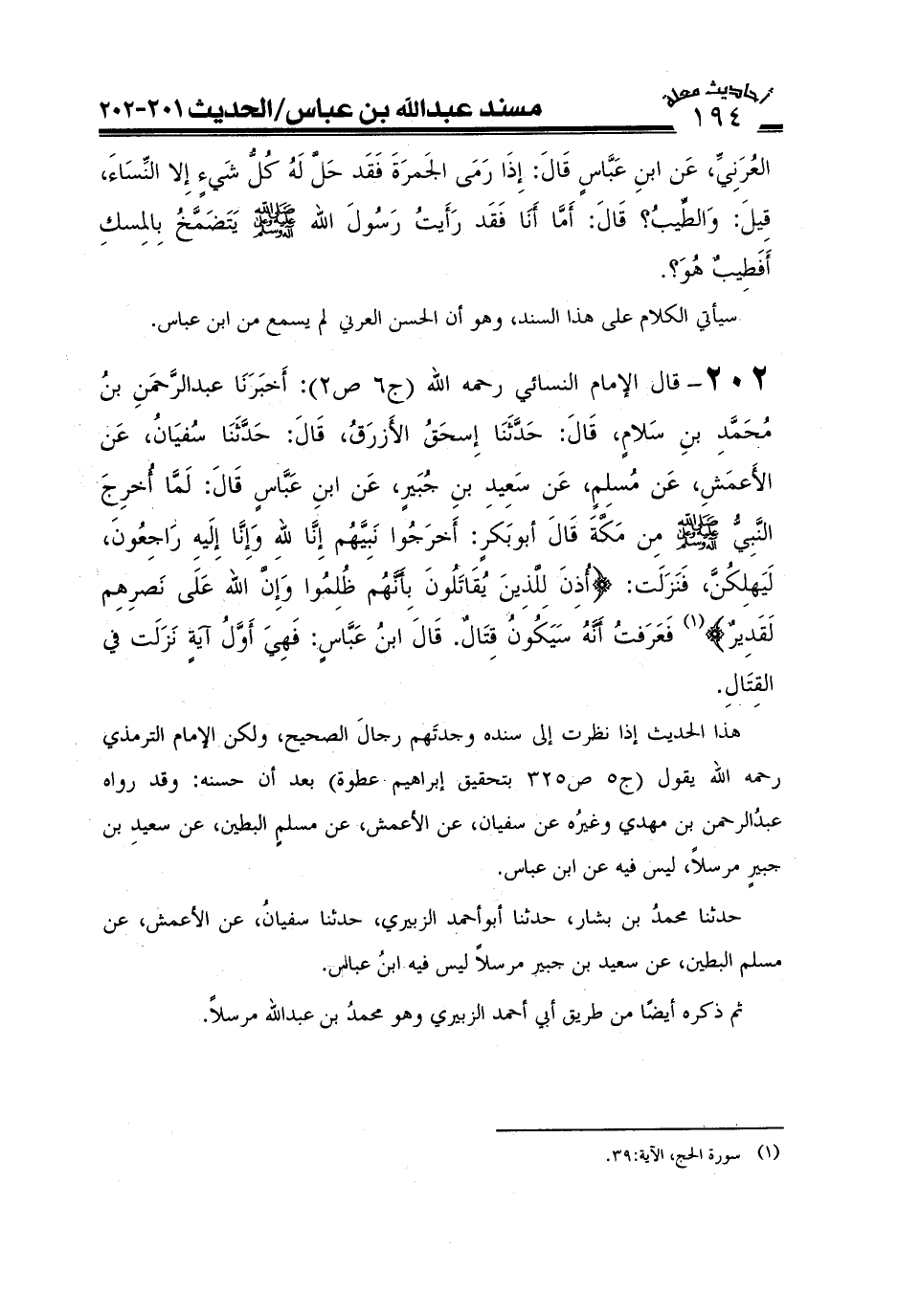 202- قال الإمام النسائي رحمه الله (ج6ص2) : أَخْبَرَنَا عَبْدُ الرَّحْمَنِ بْنُ مُحَمَّدِ بْنِ سَلَّامٍ، قَالَ: حَدَّثَنَا إِسْحَقُ الْأَزْرَقُ، قَالَ: حَدَّثَنَا سُفْيَانُ، عَنْ الْأَعْمَشِ، عَنْ مُسْلِمٍ، عَنْ سَعِيدِ بْنِ جُبَيْرٍ، عَنْ ابْنِ عَبَّاسٍ قَالَ: لَمَّا أُخْرِجَ النَّبِيُّ صَلَّى اللَّهُ عَلَيْهِ وَعَلَىَ آلِهِ وَسَلَّمَ مِنْ مَكَّةَ، قَالَ: أَبُو بَكْرٍ أَخْرَجُوا نَبِيَّهُمْ إِنَّا لِلَّهِ وَإِنَّا إِلَيْهِ رَاجِعُونَ لَيَهْلِكُنَّ، فَنَزَلَتْ: {أُذِنَ لِلَّذِينَ يُقَاتَلُونَ بِأَنَّهُمْ ظُلِمُوا وَإِنَّ اللَّهَ عَلَى نَصْرِهِمْ لَقَدِيرٌ} فَعَرَفْتُ أَنَّهُ سَيَكُونُ قِتَالٌ، قَالَ ابْنُ عَبَّاسٍ: فَهِيَ أَوَّلُ آيَةٍ نَزَلَتْ فِي الْقِتَالِ.