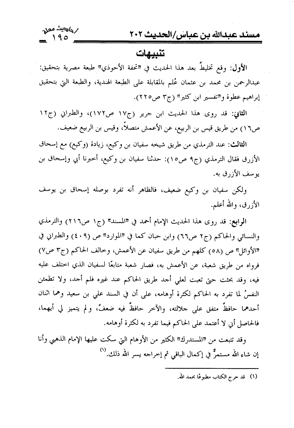الرابع: قد روى هذا الحديث الإمام أحمد في "المسند" (ج1ص216) والترمذي والنسائي والحاكم (ج2ص66) وابن حبان كما في "الموارد" ص (409) والطبراني كما في "الأوائل" ص (58) كلهم من طريق سفيان عن الأعمش، وخالف الحاكم (ج3ص7) فرواه من طريق شعبة، عن الأعمش به، فصار شعبة متابعا لسفيان الذي اختلف عليه فيه، وقد بحثت حتى تعبت لعلي أجد طريق الحاكم عند غيره فلم أجد، ولا تطمئن النفس لما تفرد به الحاكم لكثرة أوهامه، على أن في السند علي بن سعيد وهما اثنان أحدهما: حافظ متفق على جلالته، والآخر حافظ فيه ضعف، ولم يتميز لي أيهما، فالحاصل أني لا أعتمد على الحاكم فيما تفرد به لكثرة أوهامه.