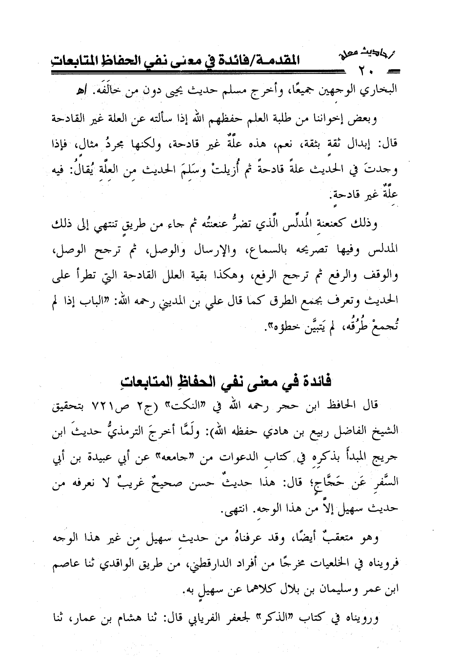 وذلك كعنعنة المدلس الذي تضر عنعنته ثم جاء من طريق تنتهي إلى ذلك الملس وفيها التصريح بسماعه، والإرسال والوصل، ثم ترجح الوصل، والوقف والرفع ثم ترجح الرفع، وهكذا بقية العلل القادحة التي تطرأ على الحديث وتعرف بجمع الطرق كما قال علي بن المديني رحمه الله: "الباب إذا لم تجمع طرقه، لم يتبين خطؤه".