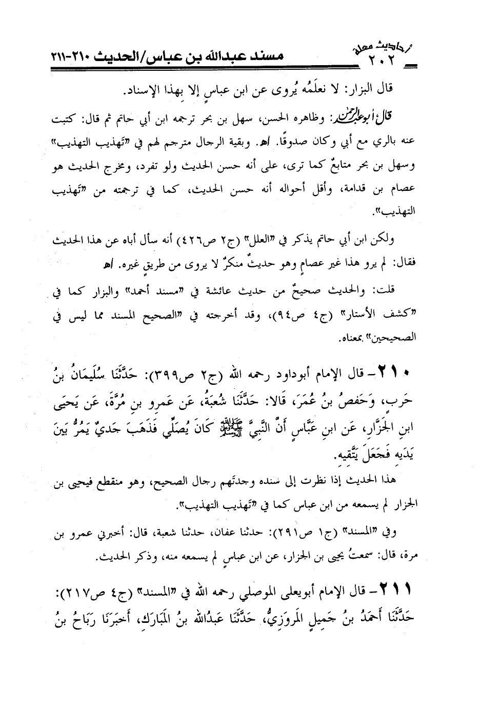 قال أبو عبد الرحمن: وظاهره الحسن، وسهل بن بحر ترجمه ابن أبي حاتم ثم قال: كتبت عنه بالري مع أبي وكان صدوقاً. اهـ. وبقية الرجال مترجم لهم في "تهذيب التهذيب" وسهل بن بحر متابع كما ترى، على أنه حسن الحديث لو تفرد، ومخرج الحديث هو عصام بن قدامة، وأقل أحواله أنه حسن الحديث، كما في ترجمته في "تهذيب التهذيب".