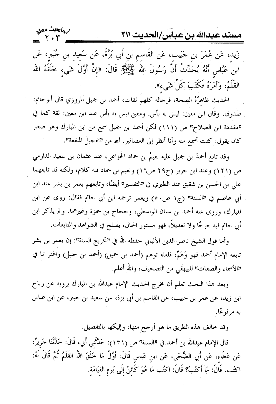 زيد عن عمر بن حبيب عن القاسم بن أبي بزة عن سعيد بن جبير: عن ابن عباس أنه يحد ث أن رسول الله صَلَّى اللَّهُ عَلَيْهِ وَعَلَىَ آلِهِ وَسَلَّمَ قال: إن أول شيء خلقه الله القلم وأمره فكتب كل شيء.