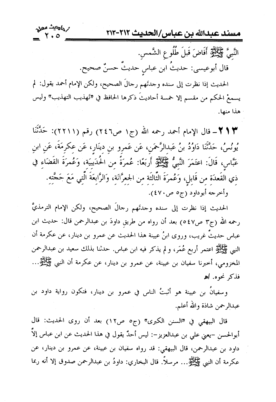 213- قال الإمام أحمد رحمه الله (ج1 ص246) رقم (2211) حَدَّثَنَا يُونُسُ حَدَّثَنَا دَاوُدُ بْنُ عَبْدِ الرَّحْمَنِ عَنْ عَمْرِو بْنِ دِينَارٍ عَنْ عِكْرِمَةَ عَنِ ابْنِ عَبَّاسٍ قَالَ اعْتَمَرَ النَّبِيُّ صَلَّى اللَّهُ عَلَيْهِ وعلى آله وَسَلَّمَ أَرْبَعًا عُمْرَةً مِنْ الْحُدَيْبِيَةِ وَعُمْرَةَ الْقَضَاءِ فِي ذِي الْقَعْدَةِ مِنْ قَابِلٍ وَعُمْرَةَ الثَّالِثَةِ مِنْ الْجِعِرَّانَةِ وَالرَّابِعَةَ الَّتِي مَعَ حَجَّتِهِ.