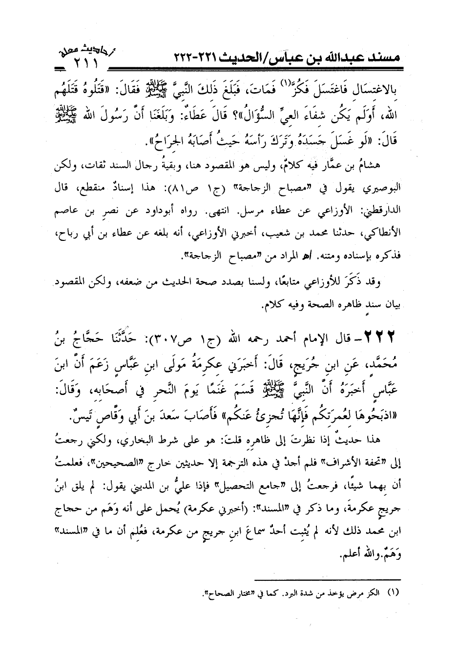 222- قال الإمام أحمد رحمه الله (ج1ص307) : حَدَّثَنَا حَجَّاجُ بْنُ مُحَمَّدٍ عَنِ ابْنِ جُرَيْجٍ قَالَ أَخْبَرَنِي عِكْرِمَةُ مَوْلَى ابْنِ عَبَّاسٍ زَعَمَ أَنَّ ابْنَ عَبَّاسٍ أَخْبَرَهُ أَنَّ النَّبِيَّ صَلَّى اللَّهُ عَلَيْهِ وَعَلَىَ آلِهِ وَسَلَّمَ قَسَمَ غَنَمًا يَوْمَ النَّحْرِ فِي أَصْحَابِهِ وَقَالَ اذْبَحُوهَا لِعُمْرَتِكُمْ فَإِنَّهَا تُجْزِئُ عَنْكُمْ فَأَصَابَ سَعْدَ بْنَ أَبِي وَقَّاصٍ تَيْسٌ.
