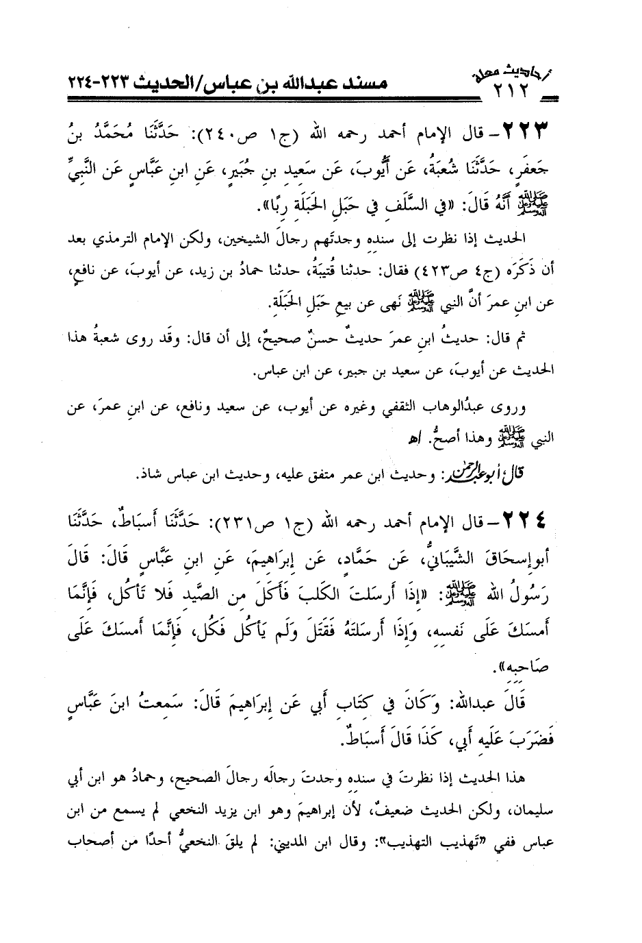 224- قال الإمام أحمد رحمه الله (ج1ص231) : حَدَّثَنَا أَسْبَاطٌ حَدَّثَنَا أَبُو إِسْحَاقَ الشَّيْبَانِيُّ عَنْ حَمَّادٍ عَنْ إِبْرَاهِيمَ عَنِ ابْنِ عَبَّاسٍ قَالَ قَالَ رَسُولُ اللَّهِ صَلَّى اللَّهُ عَلَيْهِ وَعَلَىَ آلِهِ وَسَلَّمَ إِذَا أَرْسَلْتَ الْكَلْبَ فَأَكَلَ مِنْ الصَّيْدِ فَلَا تَأْكُلْ فَإِنَّمَا أَمْسَكَ عَلَى نَفْسِهِ وَإِذَا أَرْسَلْتَهُ فَقَتَلَ وَلَمْ يَأْكُلْ فَكُلْ فَإِنَّمَا أَمْسَكَ عَلَى صَاحِبِهِ)
