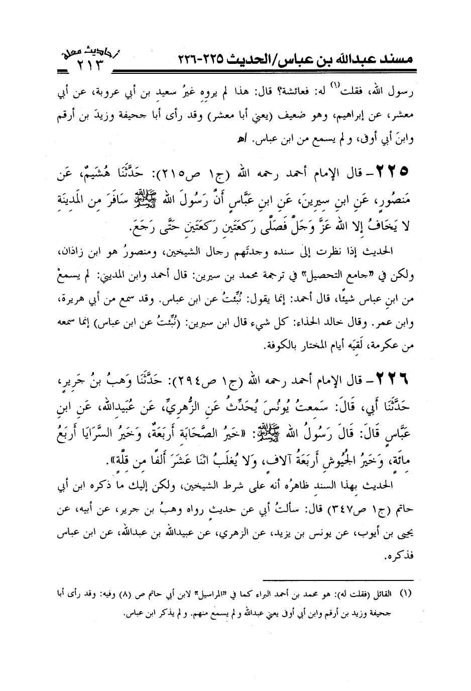 226- قال الإمام أحمد رحمه الله (ج1ص294) : حَدَّثَنَا وَهْبُ بْنُ جَرِيرٍ حَدَّثَنَا أَبِي قَالَ سَمِعْتُ يُونُسَ يُحَدِّثُ عَنِ الزُّهْرِيِّ عَنْ عُبَيْدِ اللَّهِ عَنِ ابْنِ عَبَّاسٍ قَالَ قَالَ رَسُولُ اللَّهِ صَلَّى اللَّهُ عَلَيْهِ وَعَلَىَ آلِهِ وَسَلَّمَ خَيْرُ الصَّحَابَةِ أَرْبَعَةٌ وَخَيْرُ السَّرَايَا أَرْبَعُ مِائَةٍ وَخَيْرُ الْجُيُوشِ أَرْبَعَةُ آلَافٍ وَلَا يُغْلَبُ اثْنَا عَشَرَ أَلْفًا مِنْ قِلَّةٍ) .