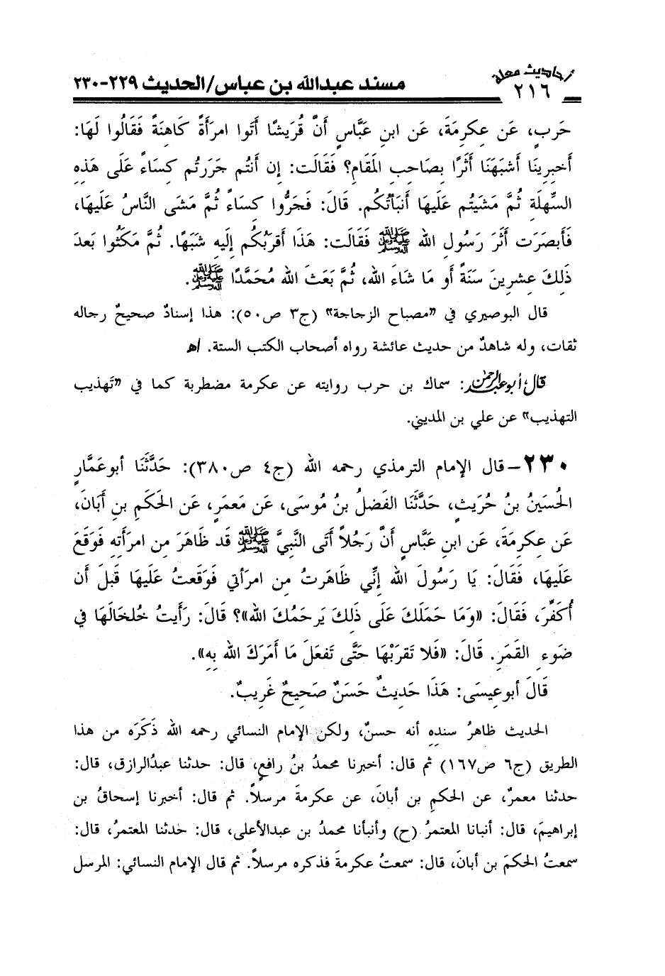 230- قال الإمام الترمذي رحمه الله (ج4ص380) : أنبأنا أبو عمار بن حسين حريث أنبأنا الفضل بن موسى عن معمر عن الحكم بن أبان عن عكرمة عن ابن عباس: أن رجلا أتى النبي صَلَّى اللَّهُ عَلَيْهِ وَعَلَىَ آلِهِ وَسَلَّمَ قد ظاهر من امرأته فوقع عليها فقال يا رسول الله! إني قد ظاهرت من زوجتي فوقعت عليها قبل أن أكفر فقال وما حملك على ذلك يرحمك الله؟ قال رأيت خلخالها في ضوء القمر قال فلا تقربها حتى تفعل ما أمرك الله به