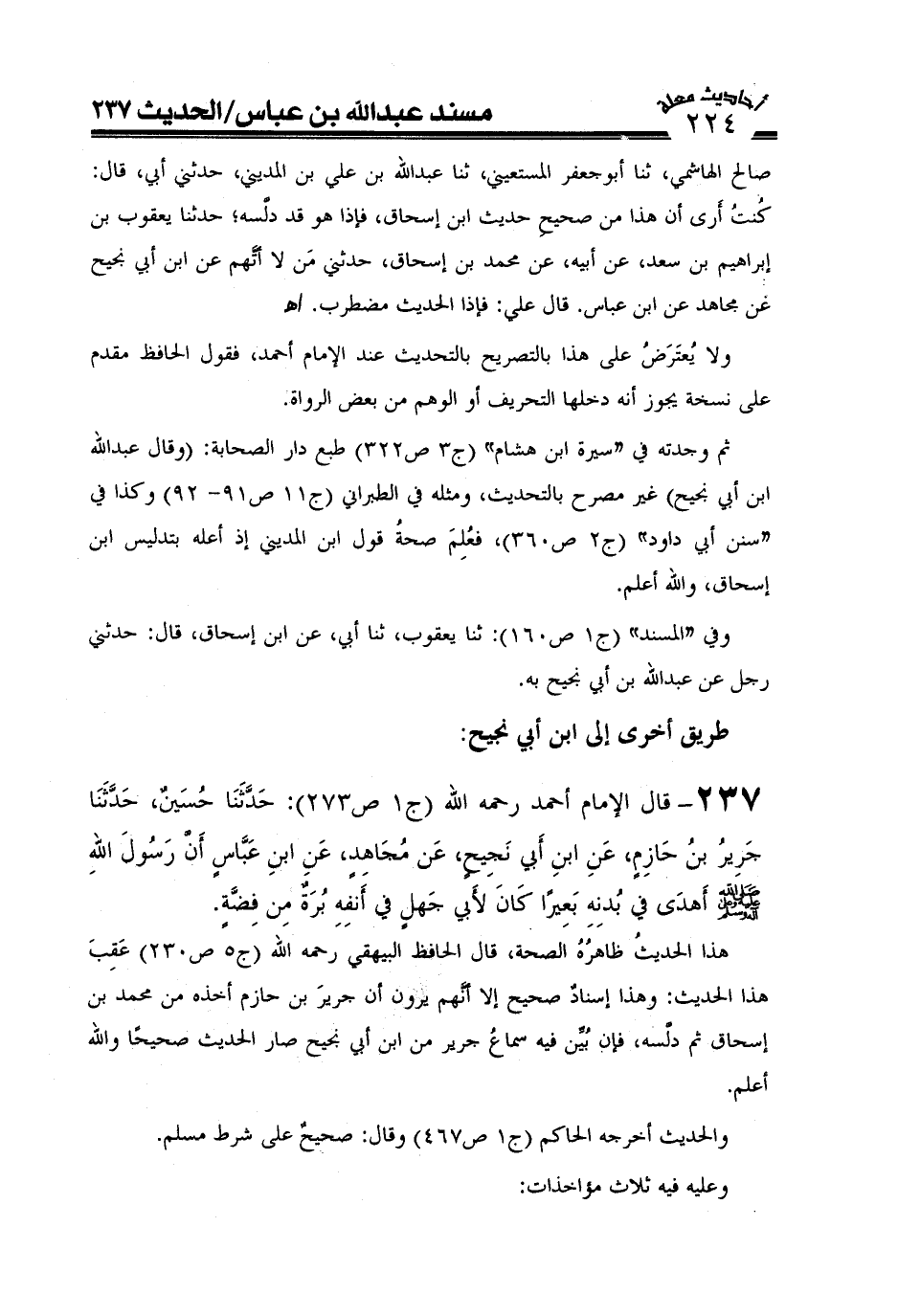 ثم وجدته في "سيرة ابن هشام" (ج3ص322) طبع دار الصحابة: (وقال عبد الله بن أبي نجيح) غير مصرح بالتحديث، ومثله في الطبراني (ج11ص91- 92) وكذا في "سنن أبي داود" (ج2ص360) فعُلِم صحة قول ابن المديني إذ أعله بالتدليس ابن اسحاق. والله أعلم.