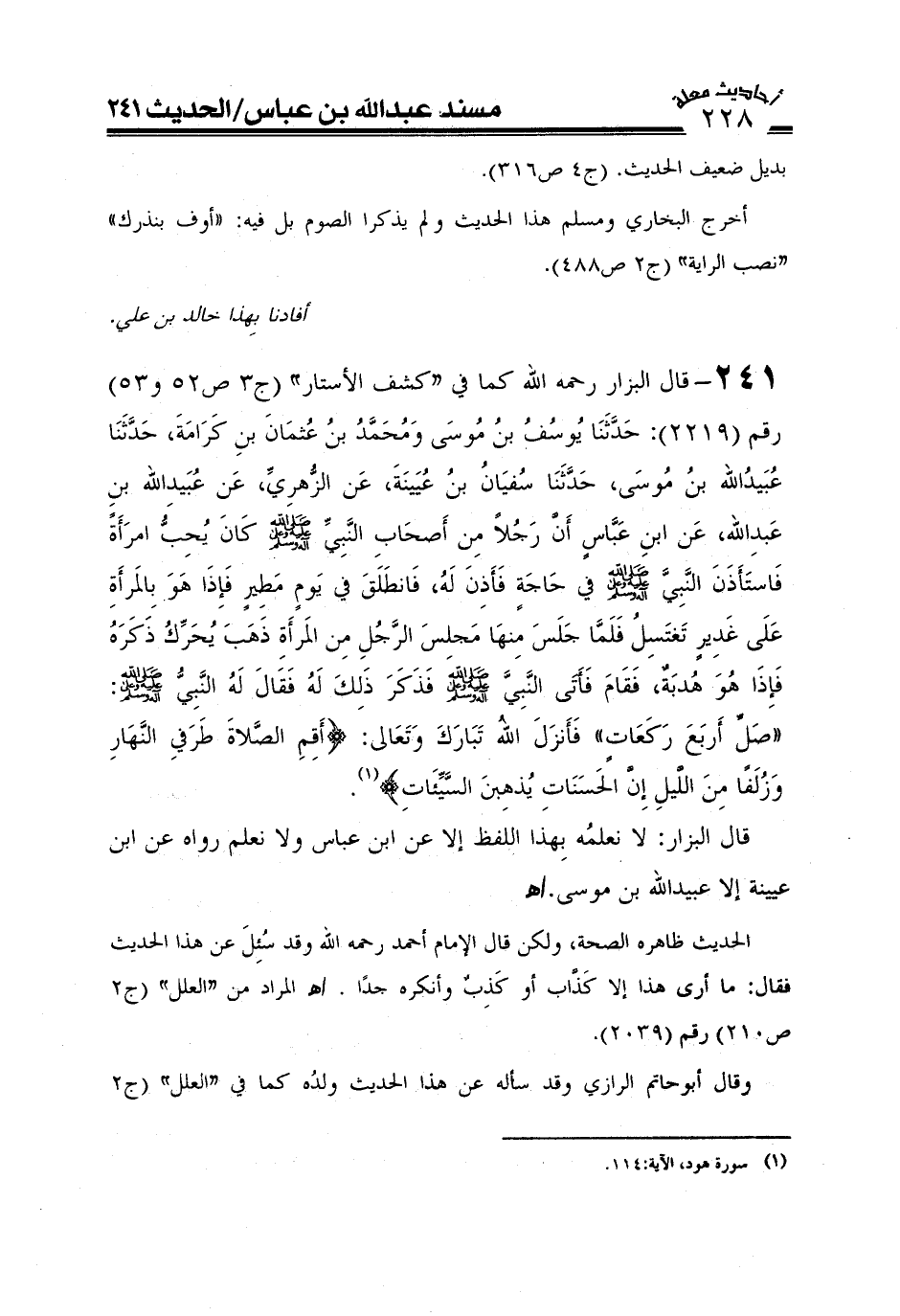 241- قال البزار رحمه الله كما في "كشف الأستار" (ج3ص52و53) رقم (2219) : يوسف بن موسى ومحمد بن عثمان بن كرامة حدثنا عبيد الله بن موسى: حدثنا سفيان بن عيينة، عن الزهري، عن عبيد الله بن عبد الله، عن ابن عباس، أن رجلاً من أصحاب النبي صَلَّى اللَّهُ عَلَيْهِ وَعَلَىَ آلِهِ وَسَلَّمَ، كان يحب امرأة، فاستأذن النبي صَلَّى اللَّهُ عَلَيْهِ وَعَلَىَ آلِهِ وَسَلَّمَ في حاجة، فأذن له فانطلق في يوم مطير، فإذا هو بامرأة على غدير ماء تغتسل، فلما جلس منها مجلس الرجل من المرأة، ذهب يحرك ذكره، فإذا هو كأنه هدبة، فذكر ذلك، فقال النبي صَلَّى اللَّهُ عَلَيْهِ وَعَلَىَ آلِهِ وَسَلَّمَ: أربع ركعات فأنزل الله عز وجل: وأقم الصلاة طرفي النهار وزلفا من الليل إن الحسنات يذهبن السيئات) .