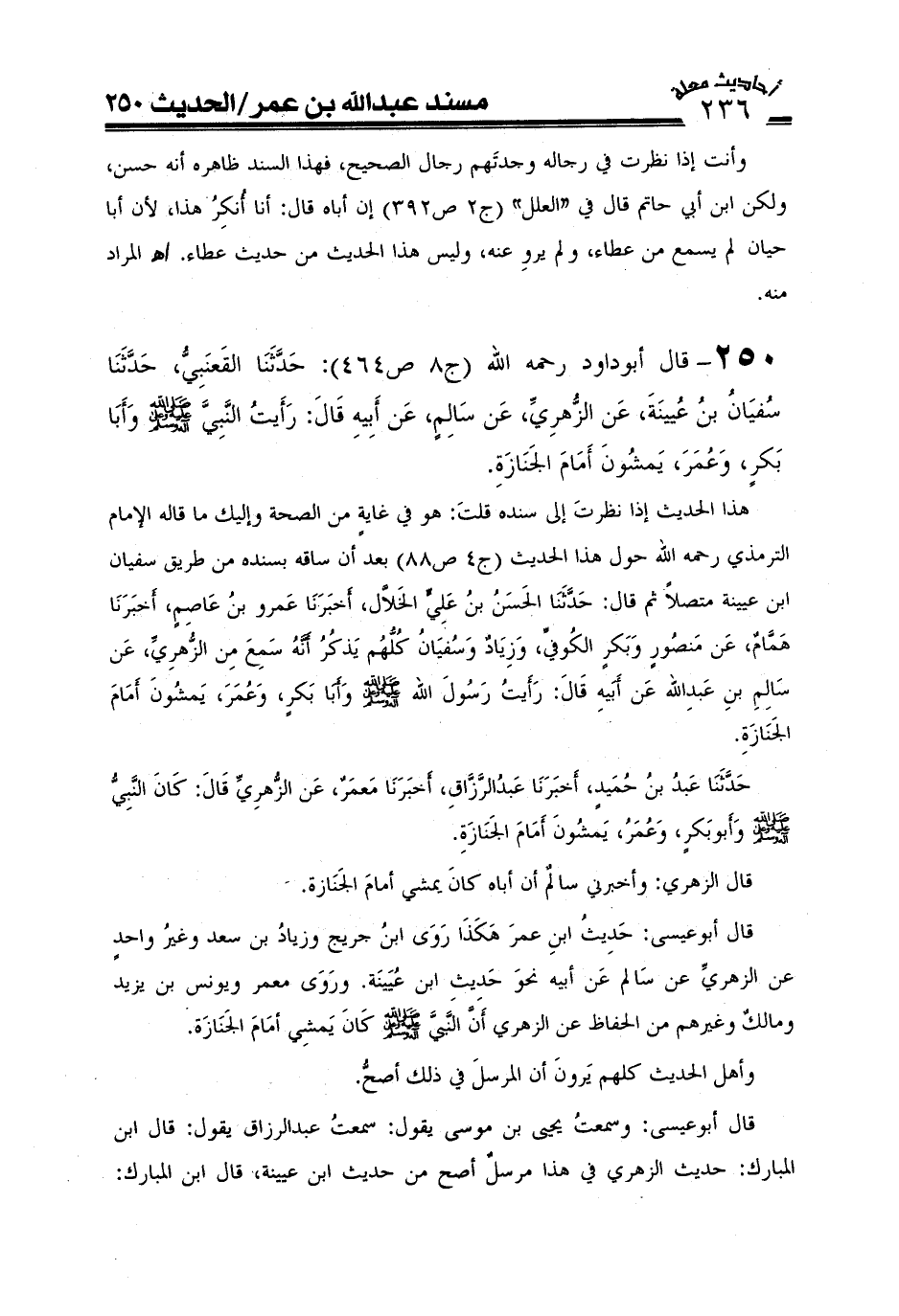 250- قال الإمام أبو داود رحمه الله (ج8ص464) : حدثنا القعنبى حدثنا سفيان بن عيينة عن الزهرى عن سالم عن أبيه قال رأيت النبى صَلَّى اللَّهُ عَلَيْهِ وَعَلَىَ آلِهِ وَسَلَّمَ وأبا بكر وعمر يمشون أمام الجنازة.