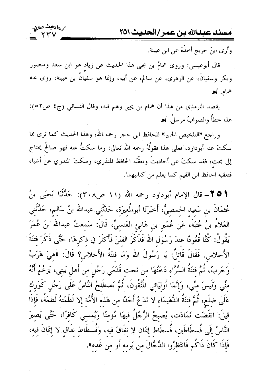 وراجع "تلخيص الحبير" للحافظ ابن حجر، وهذا الحديث كما ترى مما سكت عنهأبو داود، فعلى هذا فقوله رحمه الله تعالى: وما سكتُّ عنه فهو صالح يحتاج إلى بحث، فقد سكت عن أحاديث وتعقبه الحافظ المنذري، وسكت المنذري عن أشياء فتعقبه الحافظ ابن القيم كما يعلم من كتابيهما.