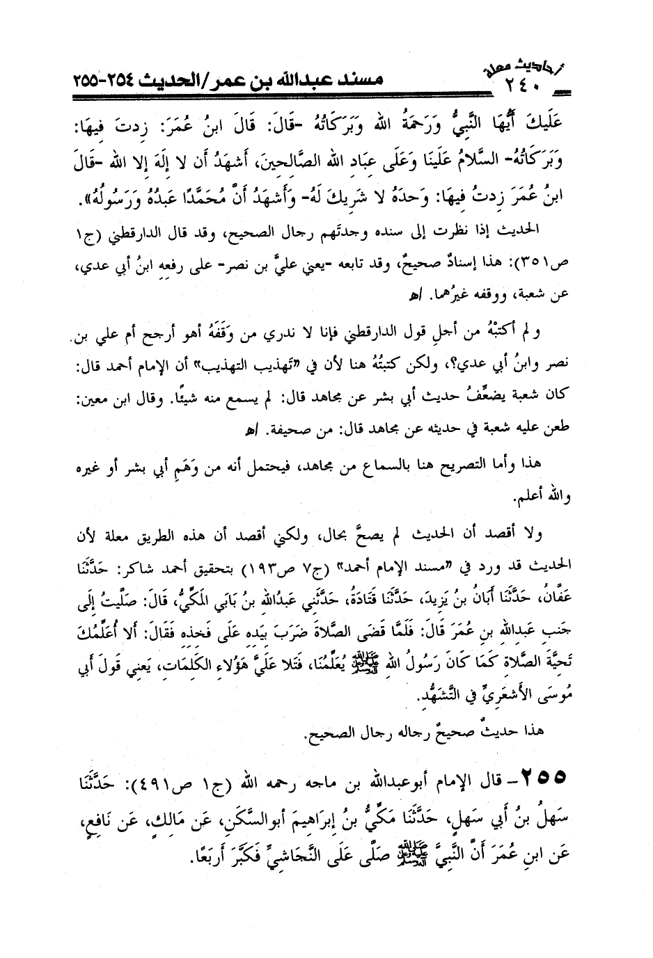 255- قال الإمام أبو عبد الله ابن ماجه رحمه الله (ج1ص491) : حدثنا سهل بن أبي سهل. حدثنا مكي بن إبراهيم أبو السكن عن مالك عن نافع عن ابن عمر , أن النبي صَلَّى اللَّهُ عَلَيْهِ وَعَلَىَ آلِهِ وَسَلَّمَ صلى على النجاشي فكبر أربعاً.
