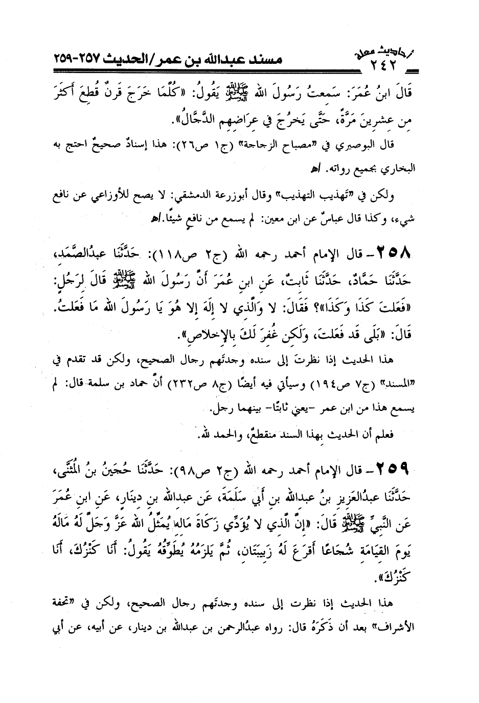 259- قال الإمام أحمد رحمه الله (ج2ص98) : - حَدَّثَنَا حُجَيْنُ بْنُ الْمُثَنَّي حَدَّثَنَا عَبْدُ الْعَزِيزِ بْنُ عَبْدِ اللَّهِ بْنِ أَبِي سَلَمَةَ عَنْ عَبْدِ اللَّهِ بْنِ دِينَارٍ عَنِ ابْنِ عُمَرَ عَنْ النَّبِيِّ صَلَّى اللَّهُ عَلَيْهِ وَعَلَىَ آلِهِ وَسَلَّمَ قَالَ إِنَّ الَّذِي لَا يُؤَدِّي زَكَاةَ مَالِهِ يُمَثِّلُ اللَّهُ عَزَّ وَجَلَّ لَهُ مَالَهُ يَوْمَ الْقِيَامَةِ شُجَاعًا أَقْرَعَ لَهُ زَبِيبَتَانِ ثُمَّ يَلْزَمُهُ يُطَوِّقُهُ يَقُولُ أَنَا كَنْزُكَ أَنَا كَنْزُكَ) .