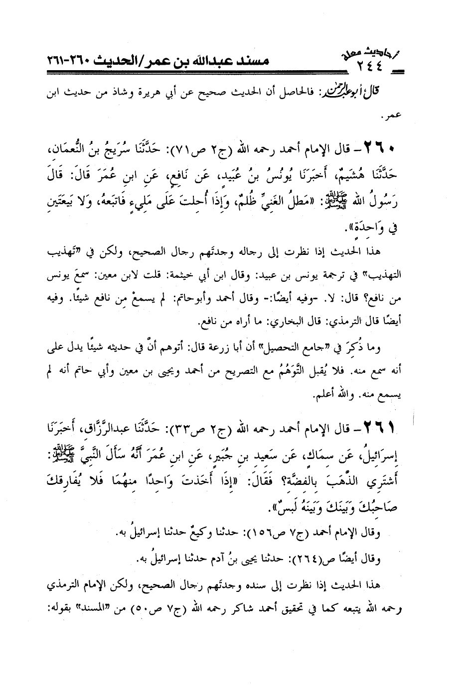 261- قال الإمام أحمد رحمه الله (ج2ص33) : حَدَّثَنَا عَبْدُ الرَّزَّاقِ أَخْبَرَنَا إِسْرَائِيلُ عَنْ سِمَاكٍ عَنْ سَعِيدِ بْنِ جُبَيْرٍ عَنِ ابْنِ عُمَرَ أَنَّهُ سَأَلَ النَّبِيَّ صَلَّى اللَّهُ عَلَيْهِ وَعَلَىَ آلِهِ وَسَلَّمَ أَشْتَرِي الذَّهَبَ بِالْفِضَّةِ فَقَالَ إِذَا أَخَذْتَ وَاحِدًا مِنْهُمَا فَلَا يُفَارِقْكَ صَاحِبُكَ وَبَيْنَكَ وَبَيْنَهُ لَبْسٌ) .