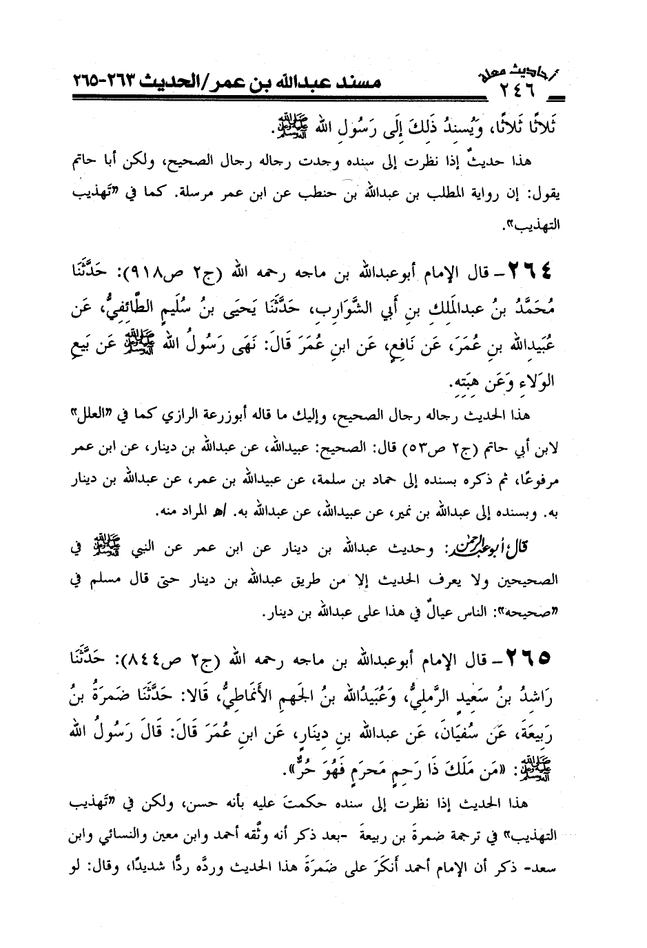 264- قال الإمام أبو عبد الله ابن ماجه رحمه الله (ج2ص918) : حدثنا محمد بن عبد الملك بن أبي الشوارب. ثنا يحيى بن سليم الطائفي عن عبيد الله بن عمر عن نافع عن ابن عمر قال نهى رسول الله عن بيع الولاء وعن هبته) .