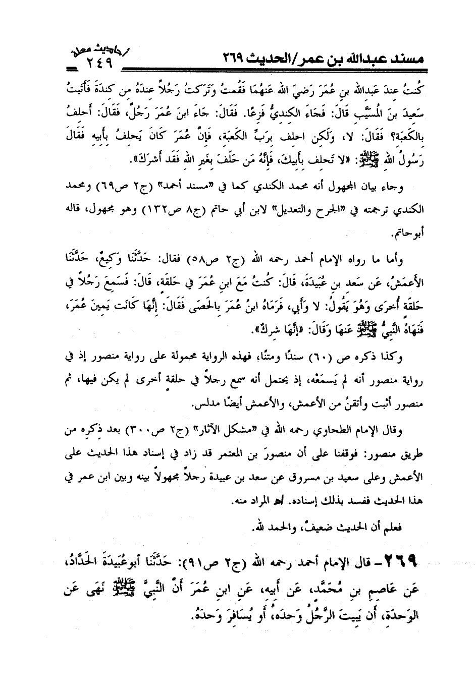 وأما مارواه الإمام أحمد رحمه الله (ج2ص58) فقال: حَدَّثَنَا وَكِيعٌ حَدَّثَنَا الْأَعْمَشُ عَنْ سَعْدِ بْنِ عُبَيْدَةَ قَالَ: كُنْتُ مَعَ ابْنِ عُمَرَ فِي حَلْقَةٍ فَسَمِعَ رَجُلًا فِي حَلْقَةٍ أُخْرَى وَهُوَ يَقُولُ لَا وَأَبِي فَرَمَاهُ ابْنُ عُمَرَ بِالْحَصَى وَقَالَ إِنَّهَا كَانَتْ يَمِينَ عُمَرَ فَنَهَاهُ النَّبِيُّ صَلَّى اللَّهُ عَلَيْهِ وَعَلَىَ آلِهِ وَسَلَّمَ عَنْهَا وَقَالَ إِنَّهَا شِرْكٌ) .