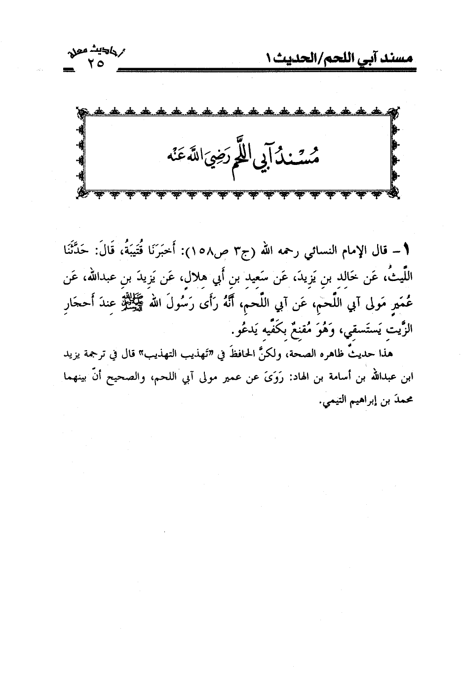1-قال الإمام النسائي رحمه الله (ج3 ص158) : أَخْبَرَنَا قُتَيْبَةُ قَالَ حَدَّثَنَا اللَّيْثُ عَنْ خَالِدِ بْنِ يَزِيدَ عَنْ سَعِيدِ بْنِ أَبِي هِلَالٍ عَنْ يَزِيدَ بْنِ عَبْدِ اللَّهِ عَنْ عُمَيْرٍ مَوْلَى آبِي اللَّحْمِ عَنْ آبِي اللَّحْمِ أَنَّهُ رَأَى رَسُول اللهْْْ صلى الله عليه وعلى آله وسلم عِنْدَ أَحْجَارِ الزَّيْتِ يَسْتَسْقِي , وَهُوَ مُقْنِعٌ بِكَفَّيْهِ يَدْعُو.