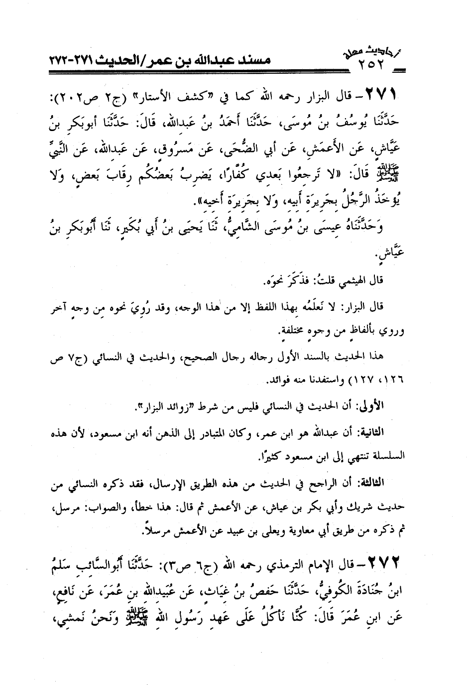 271- قال البزار رحمه الله كما في "كشف الأستار" (ج2ص202) : حَدَّثَنَا يُوسُفُ بْنُ مُوسَى، قَالَ: حَدَّثَنَا أَحْمَدُ بْنُ عَبْدِ اللهِ، قَالَ: حَدَّثَنَا أَبُو بَكْرِ بْنُ عَيَّاشٍ، عَنِ الأَعْمَشِ، عَنْ أَبِي الضُّحَى، عَنْ مَسْرُوقٍ، عَنْ عَبْدِ اللهِ، عَنِ النَّبِيِّ صَلَّى اللَّهُ عَلَيْهِ وَعَلَىَ آلِهِ وَسَلَّمَ، قَالَ: لاَ تَرْجِعُوا بَعْدِي كُفَّارًا يَضْرِبُ بَعْضُكُمْ رِقَابَ بَعْضٍ، وَلاَ يُؤْخَذُ الرَّجُلُ بِجَرِيرَةِ أَبِيهِ، وَلاَ بِجَرِيرَةِ أَخِيهِ) .