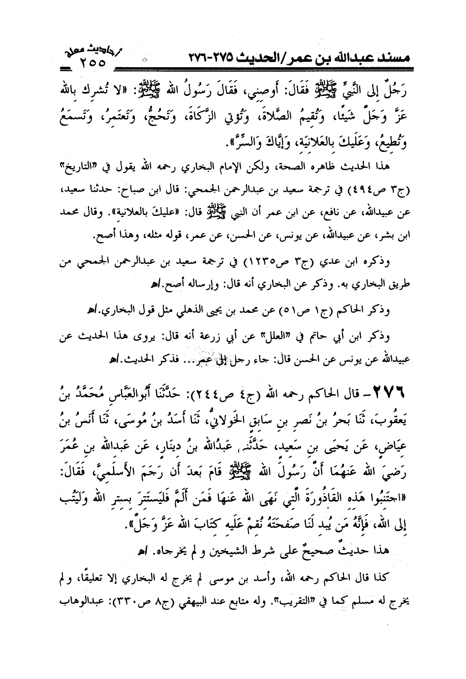 276- قال الإمام الحاكم رحمه الله (ج4ص244) : حدثنا أبو العباس محمد بن يعقوب ثنا بحر بن نصر بن سابق الخولاني ثنا أسد بن موسى ثنا أنس بن عياض عن يحيى بن سعيد حدثني عبد الله بن دينار عن عبد الله بن عمر رضي الله عنهما: أن رسول الله صَلَّى اللَّهُ عَلَيْهِ وَعَلَىَ آلِهِ وَسَلَّمَ قام بعد أن رجم الأسلمي فقال: اجتنبوا هذه القاذورة التي نهى الله عنها فمن ألم فليستتر بستر الله وليتب إلى الله فإنه من يبدلنا صفحته نقم عليه كتاب الله عز وجل