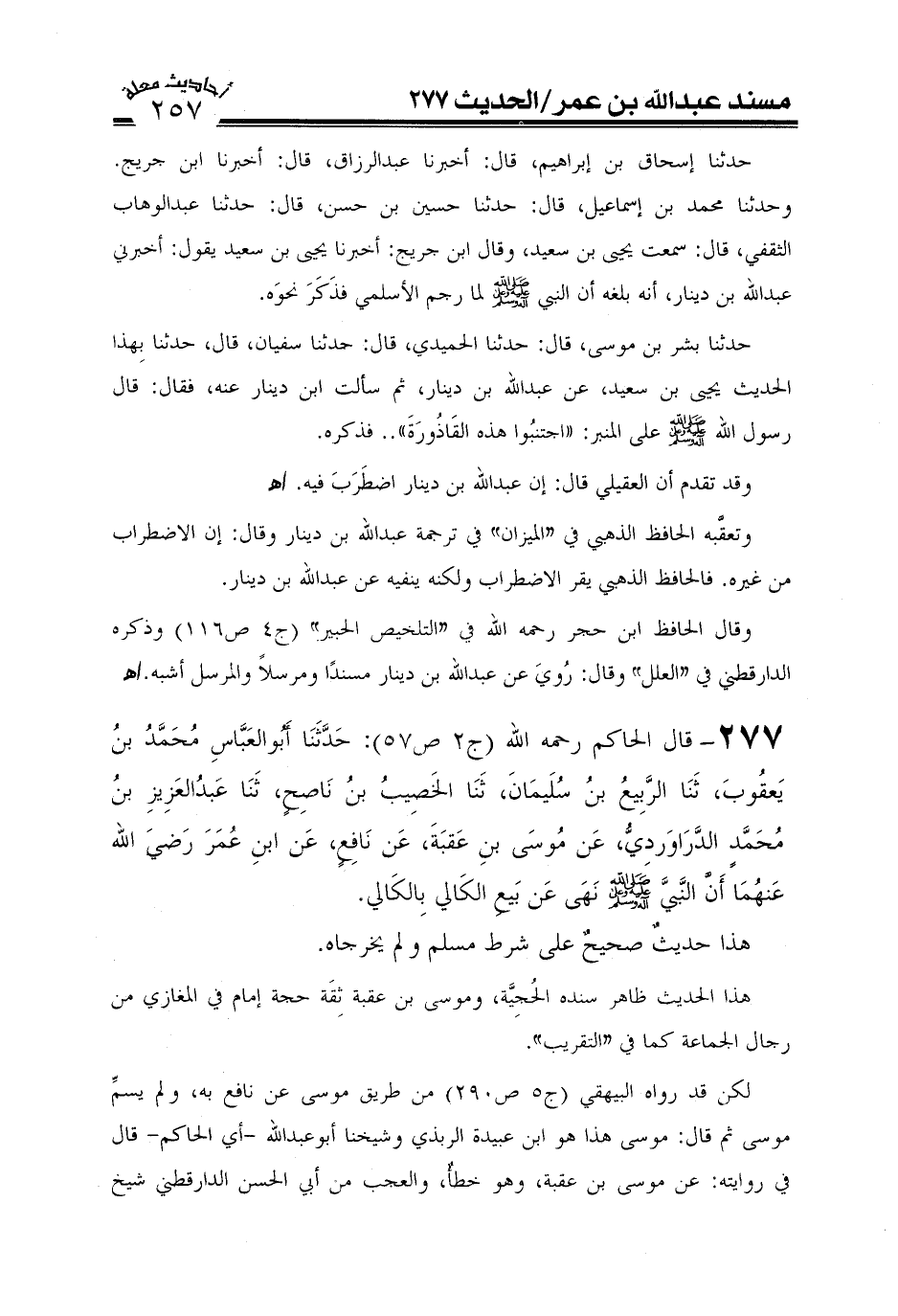 277- قال الإمام الحاكم رحمه الله (ج2ص57) : حدثنا أبو العباس محمد بن يعقوب ثنا الربيع بن سليمان ثنا الخصيب بن ناصح ثنا عبد العزيز بن محمد الدراوردي عن موسى بن عقبة عن نافع عن ابن عمر رضي الله عنهما: أن النبي صَلَّى اللَّهُ عَلَيْهِ وَعَلَىَ آلِهِ وَسَلَّمَ نهى عن بيع الكالئ بالكالئ