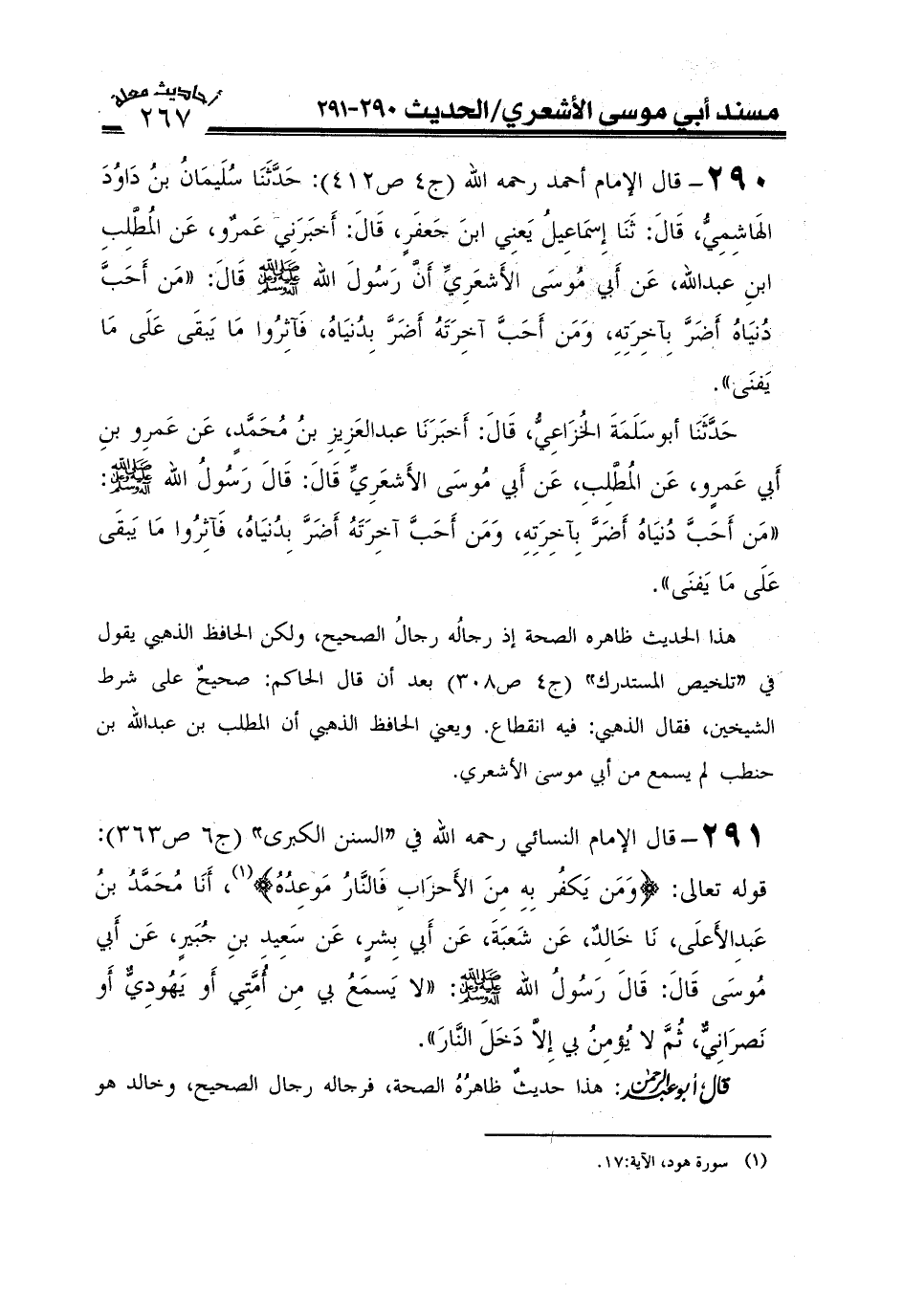 291- قال الإمام النسائي رحمه الله في "السنن الكبرى" (ج6ص363) : قوله تعالى (ومن يكفر به من الأحزاب فالنار موعده) أنا محمد بن عبد الأعلى نا خالد عن شعبة عن أبي بشر عن سعيد بن جبير عن أبي موسى قال قال رسول الله صَلَّى اللَّهُ عَلَيْهِ وَعَلَىَ آلِهِ وَسَلَّمَ: لا يسمع بي من أمتي أو يهودي أو نصراني ثم لا يؤمن بي إلا دخل النار) .