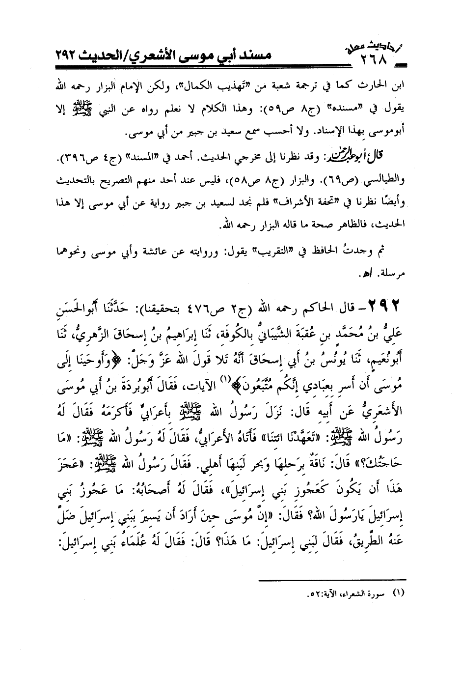 292- قال الإمام الحاكم رحمه الله (ج2ص476 بتحقيقنا) : حدثنا أبو الحسن علي بن محمد بن عقبة الشيباني بالكوفة ثنا إبراهيم بن إسحاق الزهري ثنا أبو نعيم ثنا يونس بن أبي إسحاق: أنه تلا قول الله عز وجل: {وأوحينا إلى موسى أن أسر بعبادي إنكم متبعون} فقال أبو بردة بن أبي موسى الأشعري عن أبيه قال: نزل رسول الله صَلَّى اللَّهُ عَلَيْهِ وَعَلَىَ آلِهِ وَسَلَّمَ بأعرابي فأكرمه فقال له رسول الله صَلَّى اللَّهُ عَلَيْهِ وَعَلَىَ آلِهِ وَسَلَّمَ: تعهدنا ائتنا فأتاه الأعرابي فقال له رسول الله صَلَّى اللَّهُ عَلَيْهِ وَعَلَىَ آلِهِ وَسَلَّمَ: ما حاجتك؟ فقال: ناقة برحلها وبحر لبنها أهلي فقال رسول الله صَلَّى اللَّهُ عَلَيْهِ وَعَلَىَ آلِهِ وَسَلَّمَ: عجز هذا أن يكون كعجوز بني إسرائيل فقال له أصحابه: ما عجوز بني إسرائيل يا رسول الله؟ فقال: إن موسى حين أراد أن يسير ببني إسرائيل ضل عنه الطريق فقال لبني إسرائيل ما هذا؟ قال فقال له علماء بني إسرائيل: