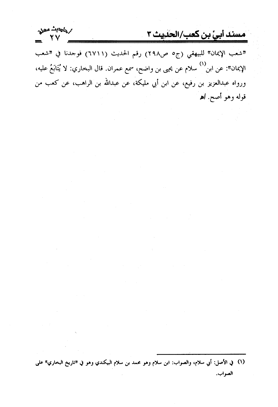 "شعب الإيمان " للبيهقي (ج5ص298) رقم حديث (6711) فوجدنا في "شعب الإيمان": عن ابن (¬1) سلام عن يحيى بن واضح سمع عمران. قال البخاري لا يُتَابَعُ عليه، ورواه عبد العزيز بن رفيع، عن ابن أبي مليكة، عن عبد الله بن الراهب عن كعب من قوله وهو أصح. اهـ