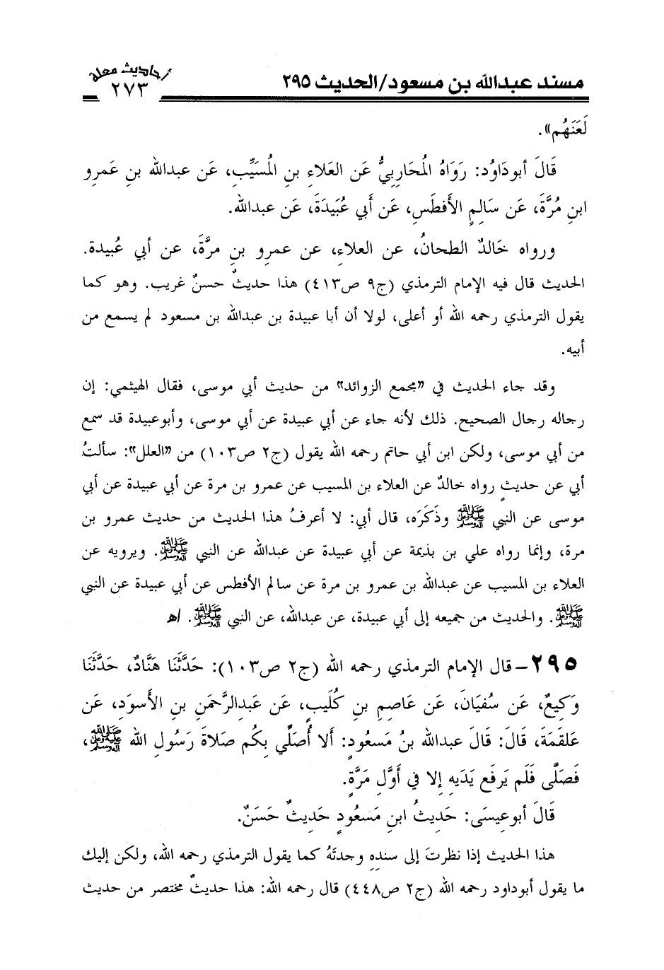 295- قال الإمام الترمذي رحمه الله (ج2ص103) : حدثنا هنّاد حدثنا وكيعٌ، عن سفيانَ، عن عاصمِ بن كُلَيْبٍ، عن عبدِ الرحم?نِ بن الأسودِ عن عَلْقَمَةَ قال: قال عبدُ الله ابنُ مسعودٍ: "ألا أُصلي بكمْ صلاةَ رسولِ الله، فصلى، فلم يرفعْ يَديْهِ إلاَّ في أول مرة"