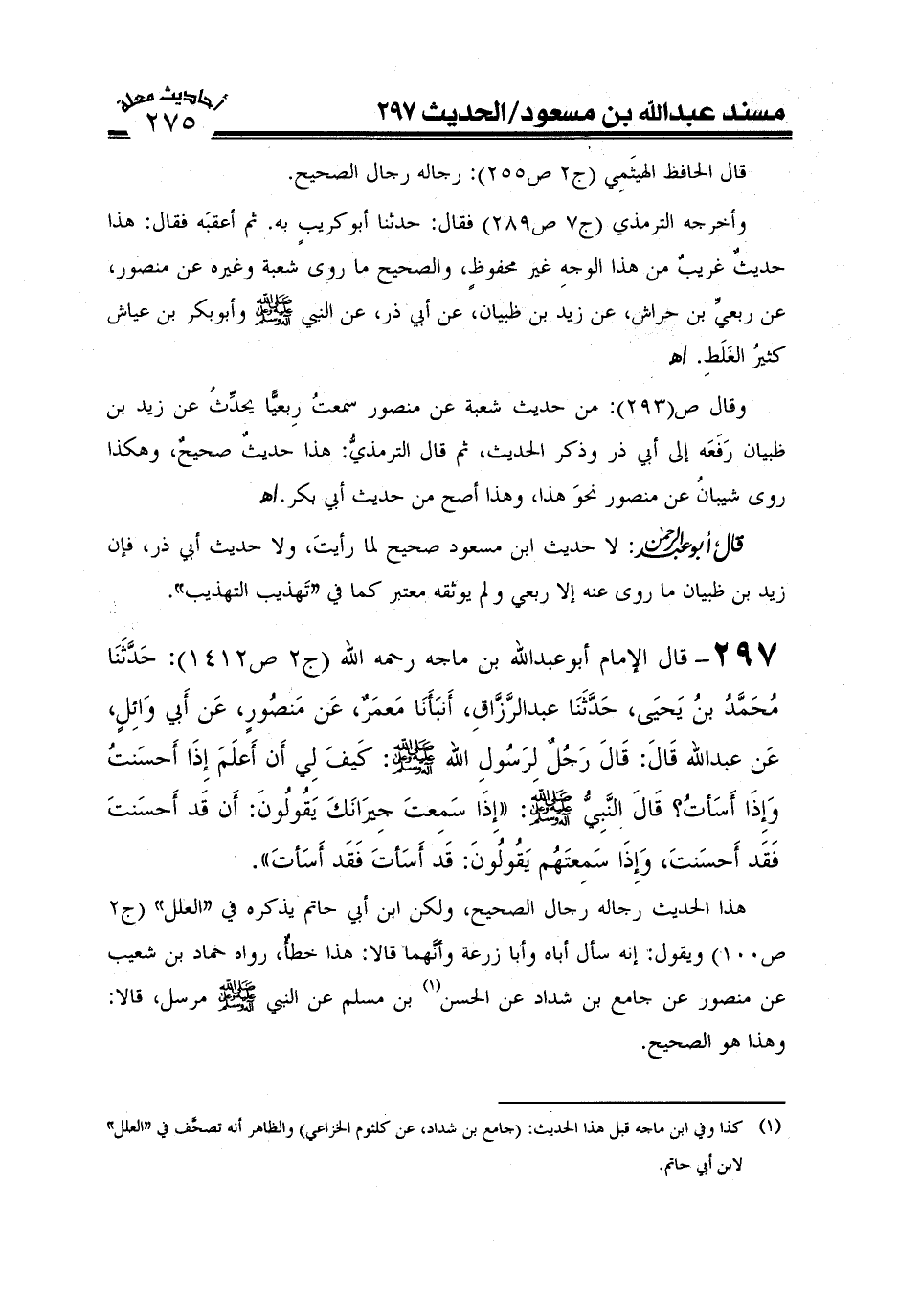 297-قال قال الإمام أبو عبد الله ابن ماجه رحمه الله (ج2ص1412) : حدثنا محمد بن يحيى حدثنا عبد الرزاق، أنبأنا معمر عن منصور عن أبي وائل عن عبد الله قال: قال رجل لرسول الله صَلَّى اللَّهُ عَلَيْهِ وَعَلَىَ آلِهِ وَسَلَّمَ كيف لي أن أعلم إذا أحسنت وإذا أسأت؟ قال النبي صَلَّى اللَّهُ عَلَيْهِ وَعَلَىَ آلِهِ وَسَلَّمَ: (إذا سمعت جيرانك يقولون أن قد أحسنت فقد أحسنت. وإذا سمعتهم يقولون قد أسأت. فقد أسأت)