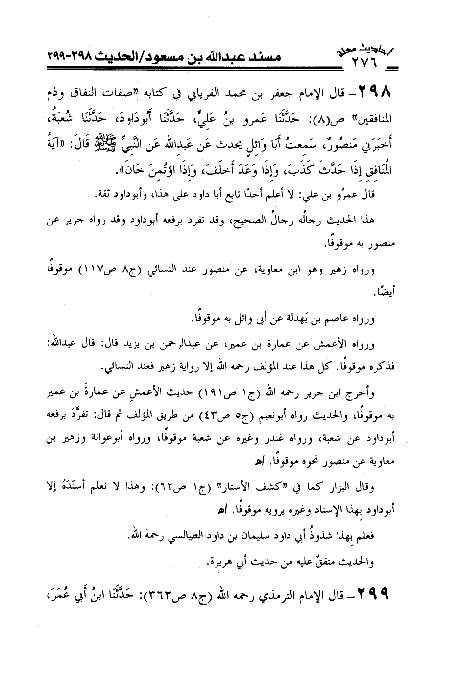 298-قال الإمام جعفر بن محمد الفريابي في كتابه "صفات المنافقين وذم المنافقين" ص (8) حدثنا عمرو بن علي، حدثنا أبو داود، حدثنا شعبة، قال: أخبرني منصور، سمعت أبا وائل، يحدث عن عبد الله، عن النبي صلى الله عليه وعلى آله وسلم قال: " آية المنافق ثلاث إذا حدث كذب وإذا وعد أخلف وإذا ائتمن خان "