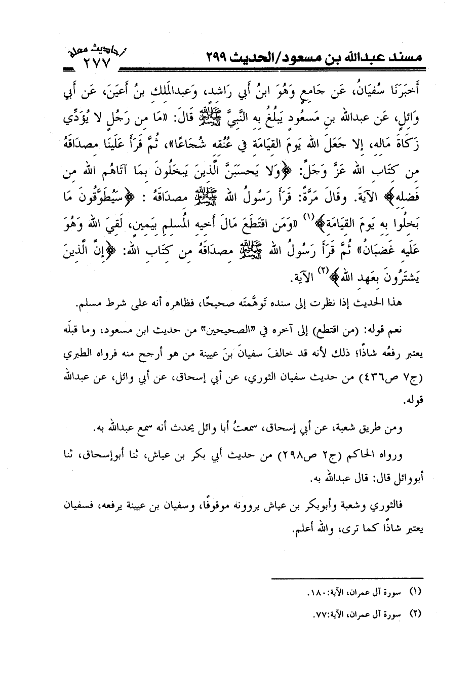 أخبرنا سُفْيَانُ عن جَامِعٍ، وَهُوَ ابنُ أَبي رَاشِدٍ وَعبْدُ المَلِكَ بنُ أَعْيَنَ عن أَبي وَائِلٍ عن عَبْدِ الله بن مسعود، يَبْلُغُ بِهِ النَّبيَّ صَلَّى اللَّهُ عَلَيْهِ وَعَلَىَ آلِهِ وَسَلَّمَ قالَ: "مَا مِنْ رَجُلٍ لاَ يُؤَدِّي زَكَاةَ مَالِهِ إلاَّ جَعَلَ الله يَوْمَ الْقِيَامَةِ فِي عُنُقِهِ شُجَاعاً، ثُمَّ قَرَأَ عَلَيْنَا مِصْدَاقَهُ مِنْ كِتَابِ الله عز وجل {ولاَ يحسبن الَّذِينَ يَبْخَلُونَ بِمَا أَتَاهُمْ الله مِنْ فَضْلِهِ} الآيَةَ، وَقَالَ مَرَّةً قَرَأَ رَسُولُ الله مِصْدَاقَهُ {سَيُطَوَّقُونَ مَا بَخِلُوا بِهِ يَوْمَ الْقِيَامَةِ} وَمَنْ اقْتَطَعَ مَالَ أَخِيهِ المسْلِمِ بِيَمِينٍ لَقِيَ الله وَهُوَ عَلَيْهِ غَضْبَانُ، ثُمَّ قَرَأَ رَسُولُ الله مِصْدَاقَهُ مِنْ كِتَابِ الله {إنَّ الَّذِينَ يَشْتَرُونَ بِعَهْدِ الله} الآيَةَ"