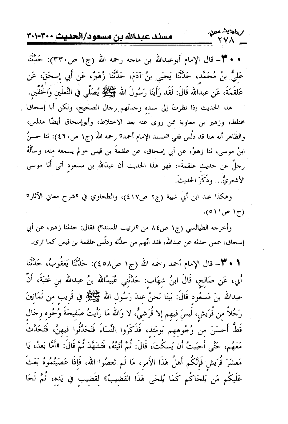300- قال الإمام أبو عبد الله ابن ماجه رحمه الله (ج2ص880) : حدثنا علي بن محمد، حدثنا يحيى بن ادم، حدثنا زهير عن أبي إسحاق عن علقمة عن عبد الله قال: - لقد رأينا رسول الله صَلَّى اللَّهُ عَلَيْهِ وَعَلَىَ آلِهِ وَسَلَّمَ يصلي في النعلين والخفين.