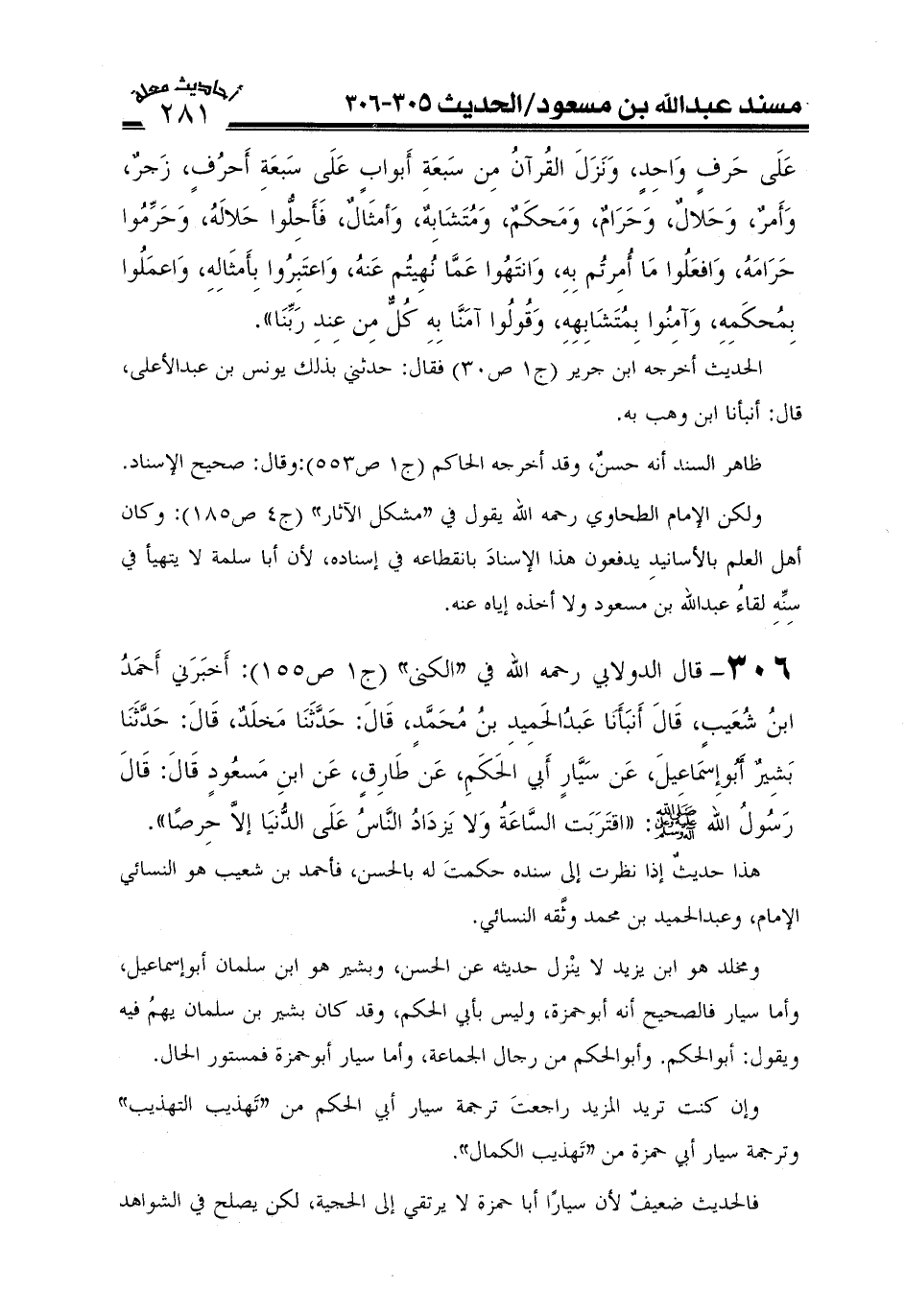 فظاهر السند أنه حسن، وقد أخرجه الحاكم (ج1ص553) وقال ك صحيح الإسناد. ولكن قال الإمام الطحاوي رحمه الله في "مشكل الآثار" (ج4ص185) : وكان أهل العلم بالأسانيد يدفعون هذا الإسناد بإنقطاعه في إسناده، لأن أبا سلمة لا يتهيأ في سِنّهِ لقاء عبد الله بن مسعود ولا أخذه عنه.