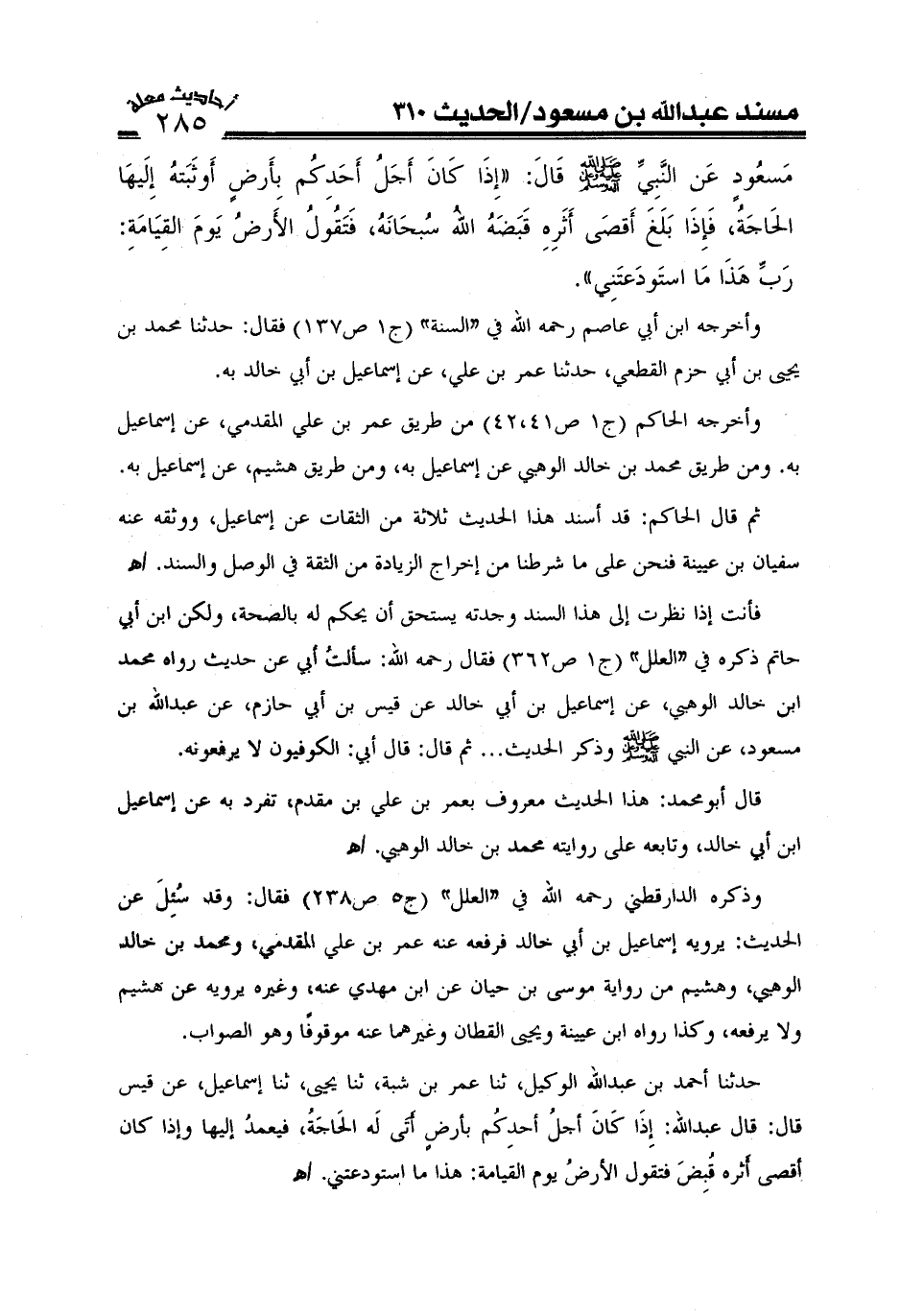 فأنت إذا نظرت إلى السند وجدته يستحق أن يحكم عليه بالصحة، ولكن ابن أبي حاتم ذكره في "العلل" (ج1ص362) فقال رحمه الله: وسألت أبي عن حديث؛ رواه محمد بن خالد الوهبي، عن إسماعيل بن أبي خالد، عن قيس بن أبي حازم، عن عبد الله بن مسعود، وذكر الحديث. ثم قال أبي: الكوفيون لا يرفعونه.