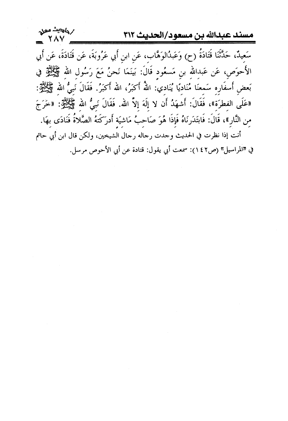 سَعِيدٌ, حَدَّثَنَا قَتَادَةُ وَعَبْدُ الْوَهَّابِ, عَنِ ابْنِ أَبِي عَرُوبَةَ عَنْ قَتَادَةَ عَنْ أَبِي الْأَحْوَصِ عَنْ عَبْدِ اللَّهِ بْنِ مَسْعُودٍ قَالَ بَيْنَمَا نَحْنُ مَعَ رَسُولِ اللَّهِ صَلَّى اللَّهُ عَلَيْهِ وَعَلَىَ آلِهِ وَسَلَّمَ فِي بَعْضِ أَسْفَارِهِ سَمِعْنَا مُنَادِيًا يُنَادِي اللَّهُ أَكْبَرُ اللَّهُ أَكْبَرُ فَقَالَ نَبِيُّ اللَّهِ صَلَّى اللَّهُ عَلَيْهِ وَعَلَىَ آلِهِ وَسَلَّمَ عَلَى الْفِطْرَةِ فَقَالَ أَشْهَدُ أَنْ لَا إِلَهَ إِلَّا اللَّهُ فَقَالَ نَبِيُّ اللَّهِ صَلَّى اللَّهُ عَلَيْهِ وَعَلَىَ آلِهِ وَسَلَّمَ خَرَجَ مِنْ النَّارِ قَالَ فَابْتَدَرْنَاهُ فَإِذَا هُوَ صَاحِبُ مَاشِيَةٍ أَدْرَكَتْهُ الصَّلَاةُ فَنَادَى بِهَا) .