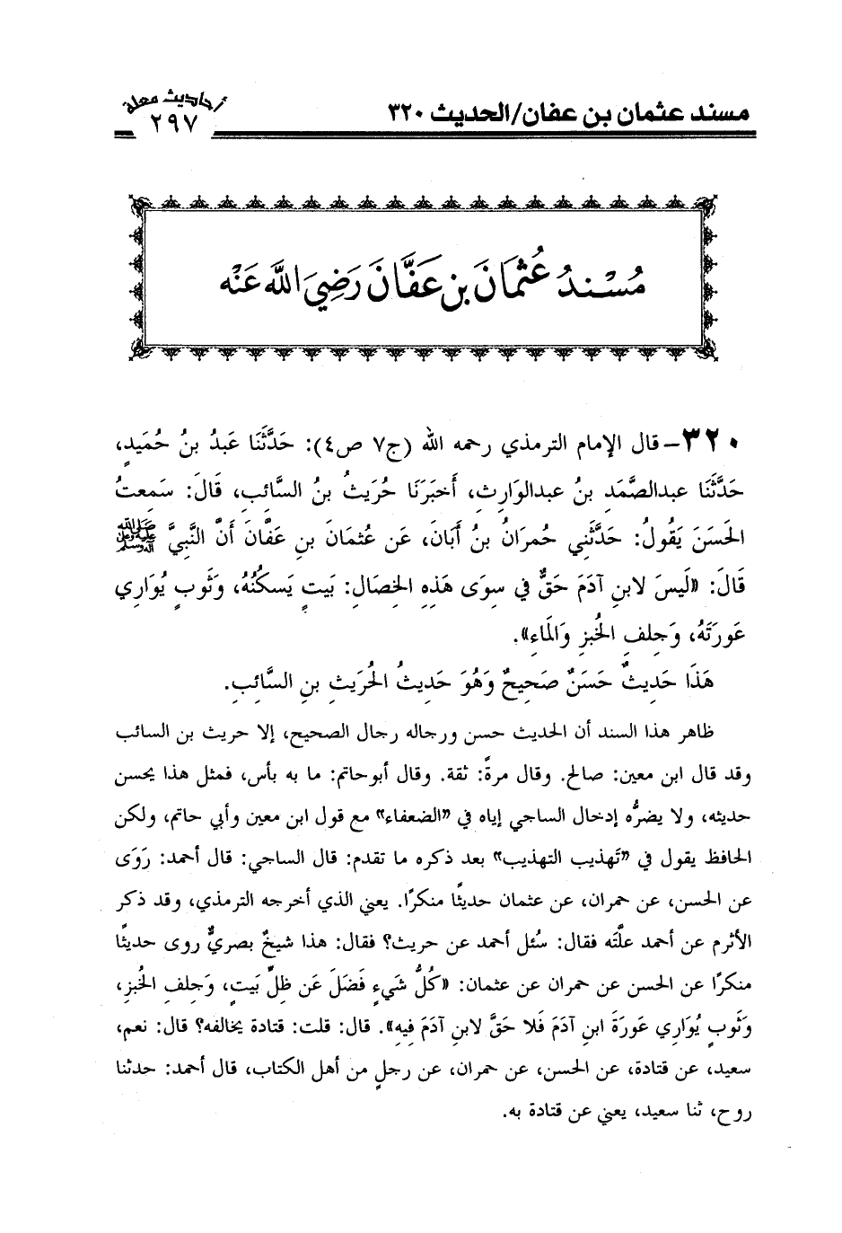 320- قال الإمام الترمذي رحمه الله (ج7ص4) : حَدَّثنا عَبْدُ بنُ حُمَيدٍ، أَخْبَرَنَا عَبْدُ الصَّمَدِ بنُ عَبْدِ الوَارِثِ، أخبرنا حُرَيثُ بنُ السَّائِبِ، قَالَ سَمِعْتُ الْحَسَنَ يَقُولُ حدثني حُمْرَانُ بنُ أَبَانَ، عَنْ عُثْمَانَ بنِ عَفَّانَ