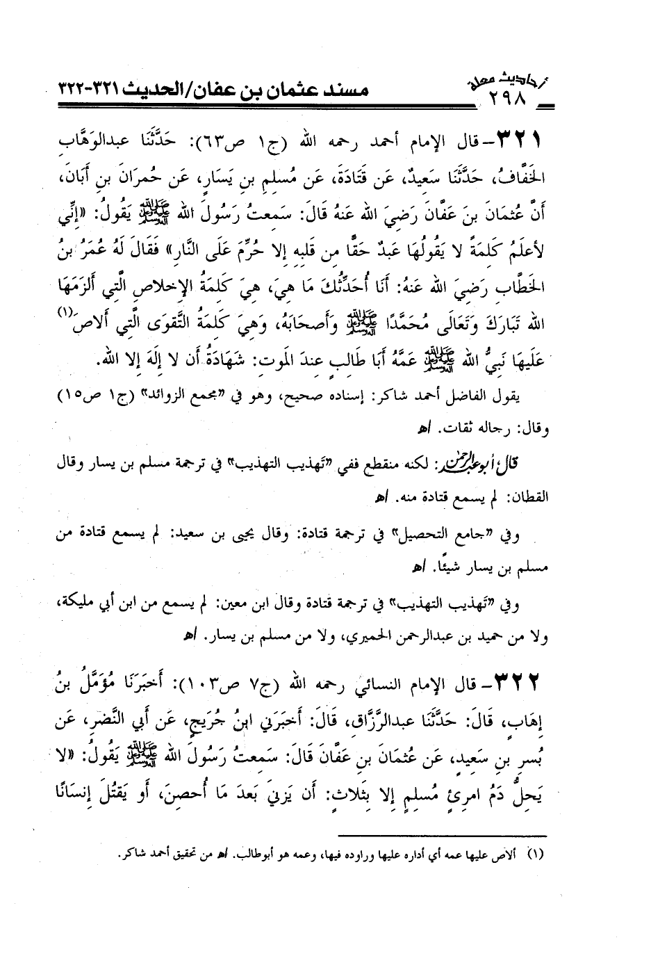 322- قال الإمام النسائي رحمه الله (ج7ص103) : أَخْبَرَنَا مُؤَمَّلُ بْنُ إِهَابٍ قَالَ حَدَّثَنَا عَبْدُ الرَّزَّاقِ قَالَ أَخْبَرَنِي ابْنُ جُرَيْجٍ عَنْ أَبِي النَّضْرِ عَنْ بُسْرِ بْنِ سَعِيدٍ عَنْ عُثْمَانَ بْنِ عَفَّانَ قَالَ سَمِعْتُ رَسُولَ اللَّهِ صَلَّى اللَّهُ عَلَيْهِ وَعَلَىَ آلِهِ وَسَلَّمَ يَقُولُ: (لَا يَحِلُّ دَمُ امْرِئٍ مُسْلِمٍ إِلَّا بِثَلَاثٍ أَنْ يَزْنِيَ بَعْدَ مَا أُحْصِنَ أَوْ يَقْتُلَ إِنْسَانًا