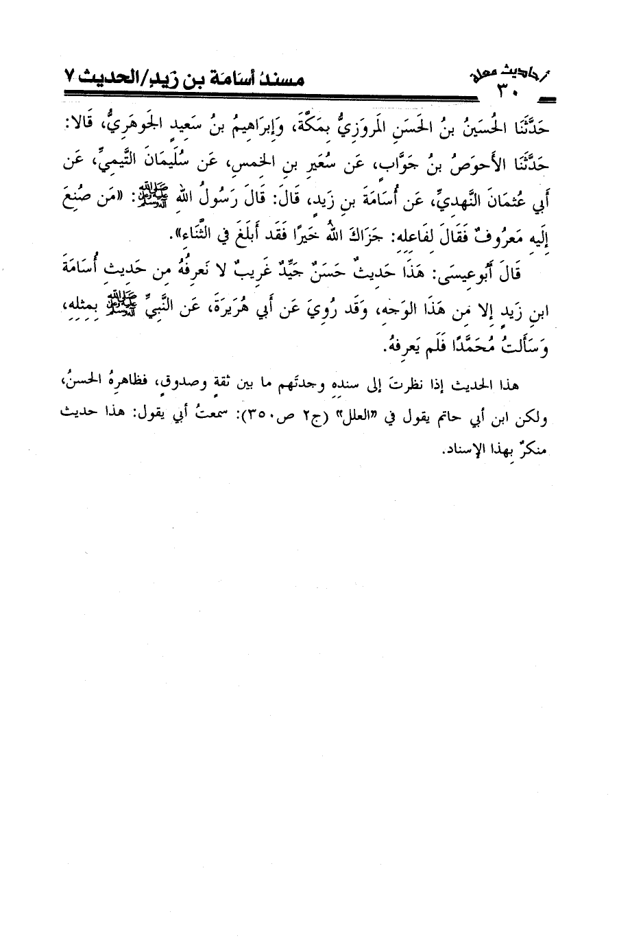 حَدَّثَنَا الْحُسَيْنُ بْنُ الْحَسَنِ الْمَرْوَزِيُّ بِمَكَّةَ وَإِبْرَاهِيمُ بْنُ سَعِيدٍ الْجَوْهَرِيُّ قَالَا حَدَّثَنَا الْأَحْوَصُ بْنُ جَوَّابٍ عَنْ سُعَيْرِ بْنِ الْخِمْسِ عَنْ سُلَيْمَانَ التَّيْمِيِّ عَنْ أَبِي عُثْمَانَ النَّهْدِيِّ عَنْ أُسَامَةَ بْنِ زَيْدٍ قَالَ: قَالَ رَسُولُ اللَّهِ صَلَّى اللَّهُ عَلَيْهِ وعلى آله وَسَلَّمَ مَنْ صُنِعَ إِلَيْهِ مَعْرُوفٌ فَقَالَ لِفَاعِلِهِ جَزَاكَ اللَّهُ خَيْرًا فَقَدْ أَبْلَغَ فِي الثَّنَاءِ.