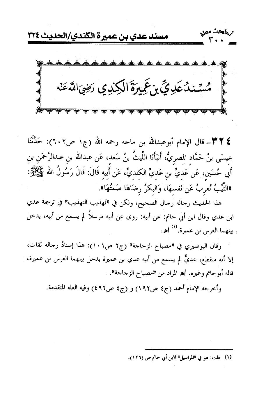 324- قال الإمام أبو عبد الله ابن ماجه رحمه الله (ج1ص602) : حدثنا عيسى بن حماد المصري. أنبأنا اليث بن سعد عن عبد الله بن عبد الرحمن بن أبي حسين عن عدي بن عدي الكندي عن أبيه قال: - قال رسول الله صَلَّى اللَّهُ عَلَيْهِ وَعَلَىَ آلِهِ وَسَلَّمَ (الثيب تعرب عن نفسها والبكر رضاها صمتها)