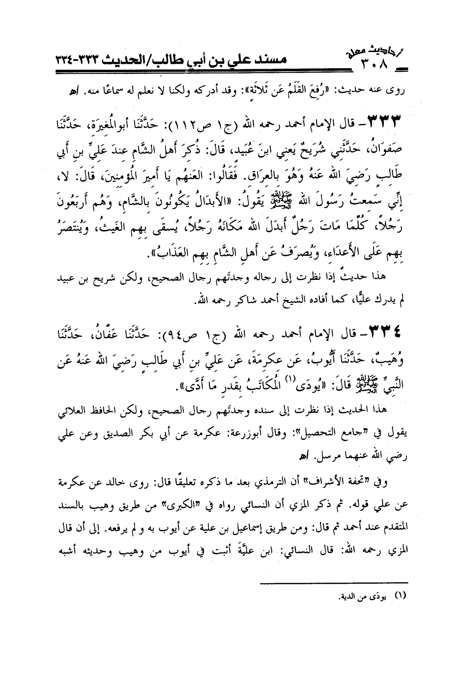 334- قال الإمام أحمد رحمه الله (ج1ص94) : حَدَّثَنَا عَفَّانُ حَدَّثَنَا وُهَيْبٌ حَدَّثَنَا أَيُّوبُ عَنْ عِكْرِمَةَ عَنْ عَلِيِّ بْنِ أَبِي طَالِبٍ رَضِيَ اللَّهُ عَنْهُ عَنْ النَّبِيِّ صَلَّى اللَّهُ عَلَيْهِ وَعَلَىَ آلِهِ وَسَلَّمَ قَالَ: (يُودَى (¬1) الْمُكَاتَبُ بِقَدْرِ مَا أَدَّىُُُُ) .