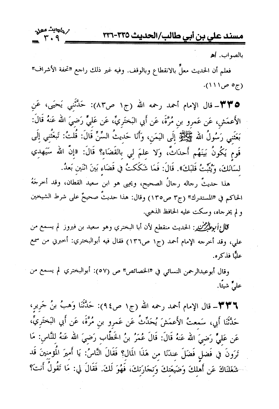 335- قال الإمام أحمد رحمه الله (ج1ص83) : حَدَّثَنِي يَحْيَى عَنِ الْأَعْمَشِ عَنْ عَمْرِو بْنِ مُرَّةَ عَنْ أَبِي الْبَخْتَرِيِّ عَنْ عَلِيٍّ رَضِيَ اللَّهُ عَنْهُ قَالَ بَعَثَنِي رَسُولُ اللَّهِ صَلَّى اللَّهُ عَلَيْهِ وَعَلَىَ آلِهِ وَسَلَّمَ إِلَى الْيَمَنِ وَأَنَا حَدِيثُ السِّنِّ قَالَ قُلْتُ تَبْعَثُنِي إِلَى قَوْمٍ يَكُونُ بَيْنَهُمْ أَحْدَاثٌ وَلَا عِلْمَ لِي بِالْقَضَاءِ قَالَ إِنَّ اللَّهَ سَيَهْدِي لِسَانَكَ وَيُثَبِّتُ قَلْبَكَ قَالَ فَمَا شَكَكْتُ فِي قَضَاءٍ بَيْنَ اثْنَيْنِ بَعْدُ