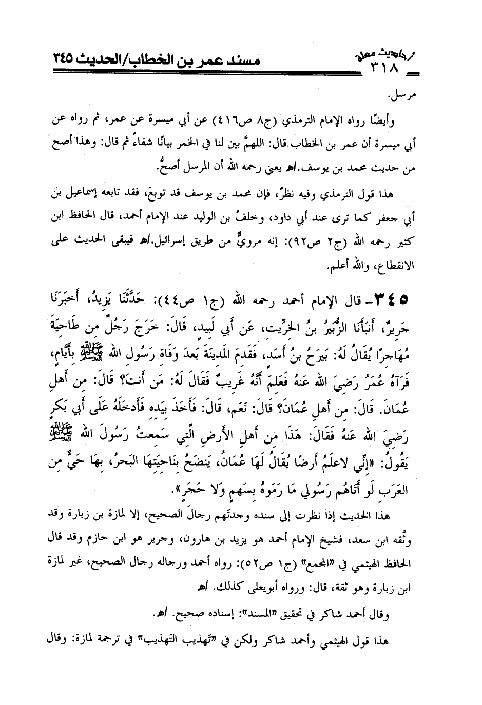 وأيضاً رواه الإمام الترمذي (ج8ص416) عن أبي ميسرة عن عمر، ثم رواه عن أبي ميسرة أن عمر بن الخطاب قال: اللهم بين لنا في الخمر بياناً شافياً ثم قال: وهذا أصح من حديث محمد بن يوسف. اهـ يعني رحمه الله أن المرسل أصح.