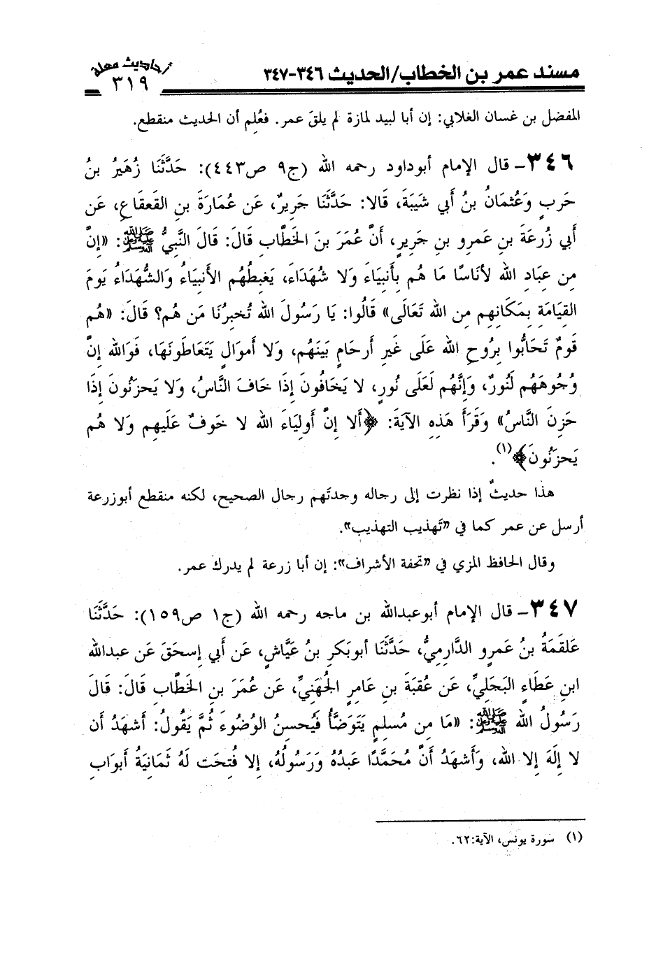 346- قال الإمام أبو داود رحمه الله (ج9ص443) حدثنا زُهَيْرُ بنُ حَرْبٍ وَعُثْمَانُ بنُ أبِي شَيْبَةَ قالاَ أخبرنا جَرِيرٌ عن عُمَارَةَ بنِ الْقَعْقَاعِ عن أبي زُرْعَةَ بنِ عَمْرِو بنِ جَرِيرٍ أنَّ عُمَرَ بنَ الْخَطَّابِ قالَ قالَ النَّبيُّ صَلَّى اللَّهُ عَلَيْهِ وَعَلَىَ آلِهِ وَسَلَّمَ: " إنَّ مِنْ عِبَادِ الله لأُنَاساً مَا هُمْ بِأنْبِيَاءَ وَلاَ شُهَدَاءَ يَغْبِطُهُم الأَنْبِيَاءُ وَالشُّهَدَاءُ يَوْمَ الْقِيَامَةِ بِمَكَانِهِمْ مِنَ الله. قالُوا: يَارَسُولَ الله تُخْبِرُنَا مَنْ هُمْ؟ قالَ: هُمْ قَوْمٌ تَحَابُّوا بِرُوحِ الله عَلَى غَيْرِ أرْحَامٍ بَيْنَهُمْ وَلاَ أمْوَالٍ يَتَعَاطُونَهَا فَوَالله إنَّ وُجُوهَهُمْ لَنُورٌ وَإنَّهُمْ لَعَلَى نُورٍ، لاَ يَخَافُونَ إذَا خَافَ النَّاسُ، وَلاَ يَحْزَنُونَ إذَا حَزِنَ النَّاسُ، وَقَرَأَ هذِهِ الآيَةَ: {ألاَ إنَّ أوْلِيَاءَ الله لاَ خَوْفٌ عَلَيْهِمْ وَلاَ هُمْ يَحْزَنُونَ} ".