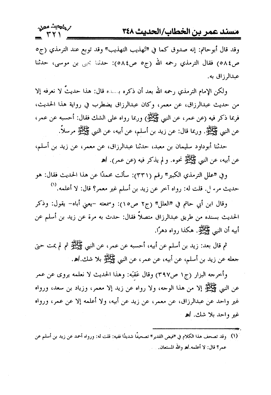 (¬1) وقد تصحف هذا الكلام في "فيض القدير "تصحيفاً شديداً ففيه: قلت له: ورواه أحمد عن زيد بن أسلم عن عمر؟ قال: لا أعلمه. اهـ والله المستعان.
