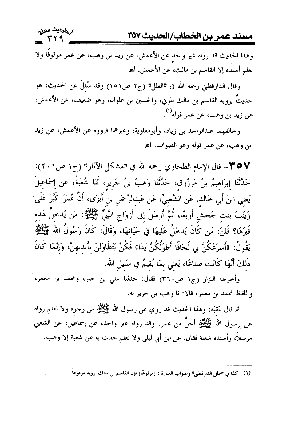 357- قال الإمام الطحاوي رحمه الله في "مشكل الآثار" (ج1ص201) : حدثنا إبراهيم بن مرزوق، ثنا وهب بن جرير، حدثنا شعبة، عن إسماعيل يعني ابن أبي خالد، عن الشعبي، عن عبد الرحمن بن أبزى، أن عمر كبر على زينب بنت جحش أربعا، ثم أرسل إلى أزواج النبي عليه السلام من يدخل هذه قبرها قلن: من كان يدخل عليها في حياتها وقال: كان رسول الله عليه السلام يقول: " أسرعكن بي لحاقا أطولكن يدا " فكن يتطاولن بأيديهن وإنما كان ذلك أنها كانت صناعا يعني بما يقيم في سبيل الله.