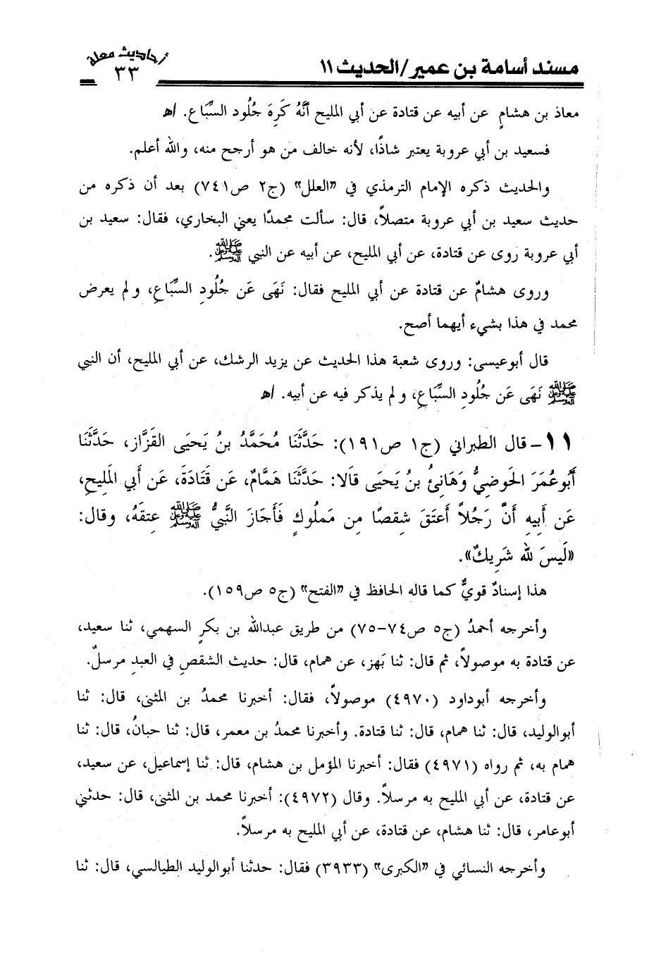 11-قال الطبراني (ج1ص191) : حَدَّثَنَا مُحَمَّدُ بن يَحْيَى الْقَزَّازُ، حَدَّثَنَا أَبُو عُمَرَ الْحَوْضِيُّ، وَهَانِي بن يَحْيَى، قَالا: حَدَّثَنَا هَمَّامٌ، عَنْ قَتَادَةَ، عَنْ أَبِي الْمَلِيحِ، عَنْ أَبِيهِ، أَنَّ رَجُلا أَعْتَقَ شِقْصًا مِنْ مَمْلُوكٍ، فَأَجَازَ النَّبِيُّ صَلَّى اللَّهُ عَلَيْهِ وَعَلَى آلِهِ وَسَلَّمَ عِتْقَهُ، وَقَالَ: لَيْسَ لِلَّهِ شَرِيكٌ. هذا إسناد قوى كما قال الحافظ في "الفتح" (ج5ص159) .