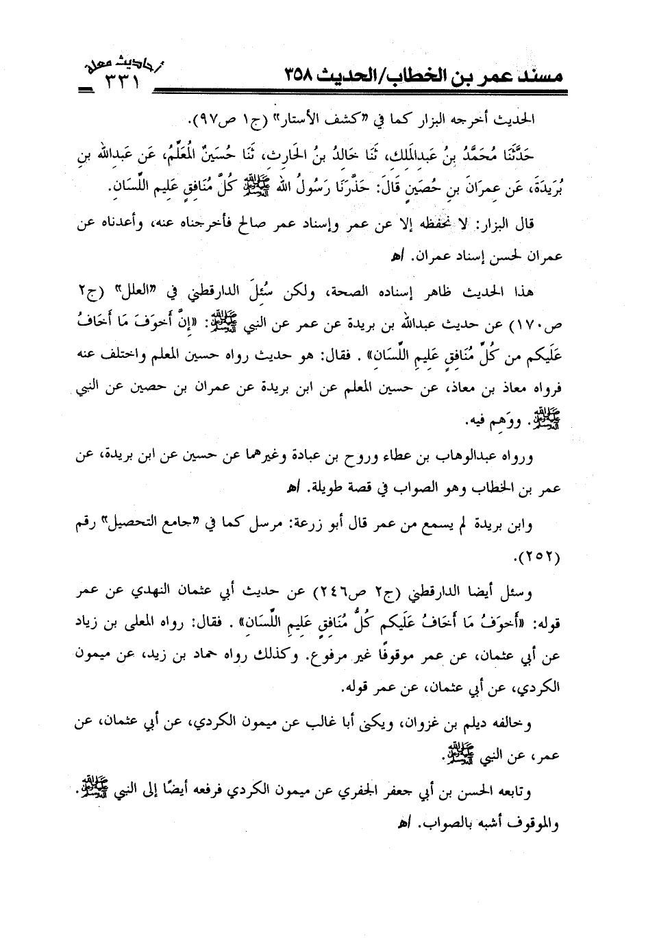 وسئل أيضاً الدارقطني في "العلل" (ج2ص246) عن حديث أبي عثمان النهدي عن عمر قوله أخوف ما أخاف عليكم كل منافق عليم اللسان.