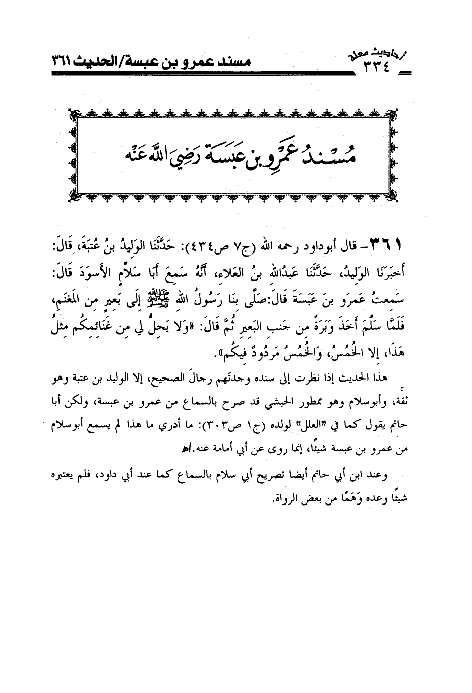 361- قال الإمام أبو داود رحمه الله (ج7ص434) : حدثنا الْوَلِيدُ بن عُتْبَةَ قال أخبرنا الوَلِيدُ حدثنا عَبْدُ الله بنُ الْعَلاَءِ أنَّهُ سَمِعَ أبا سَلاَّمٍ الأسْوَدَ قالَ سَمِعْتُ عَمْرَو بنَ عَبْسَةَ